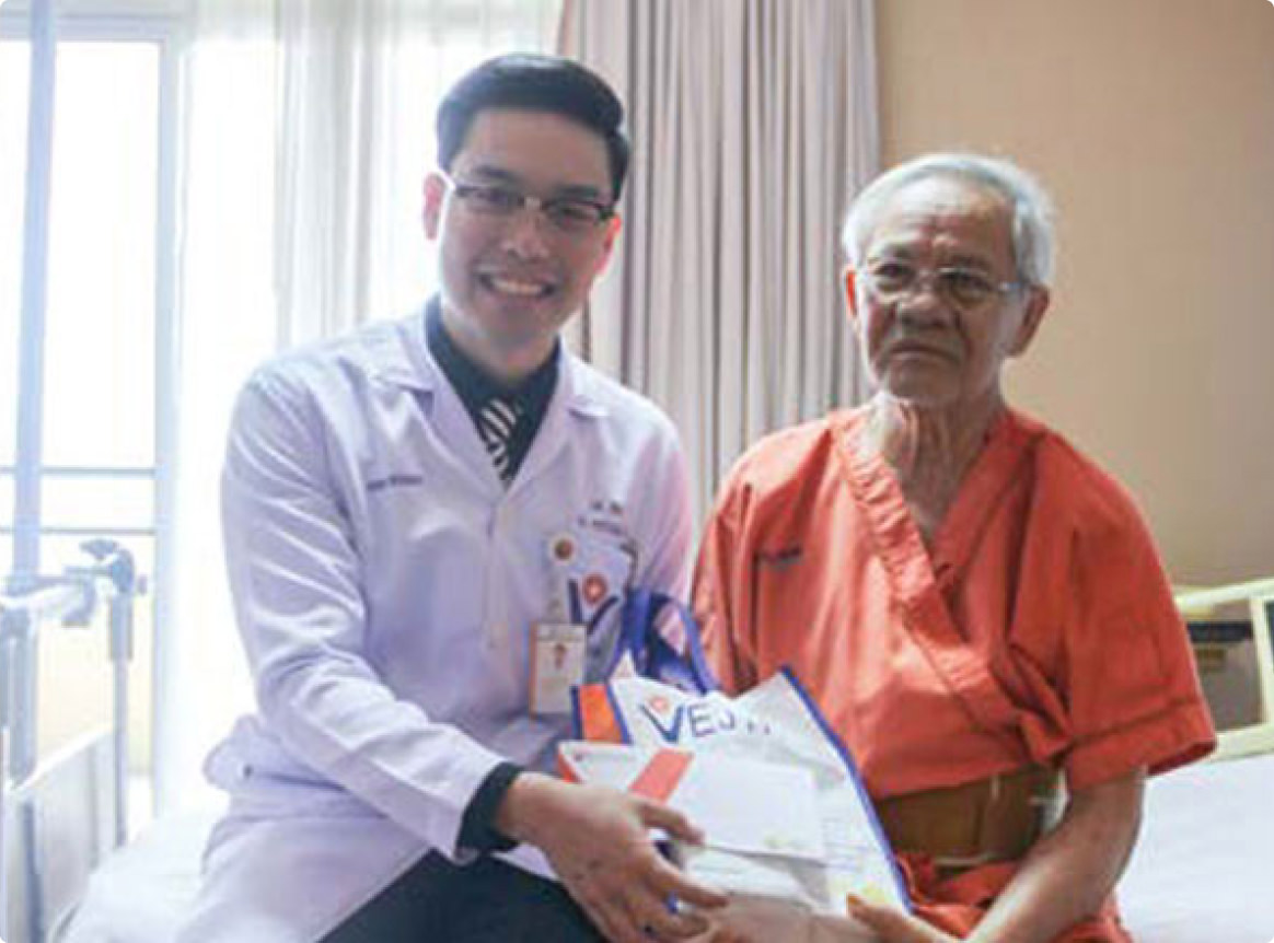 “Khun Chalin came to the hospital with chronic lower back and sciatic pain. The pain was going down to leg and getting worse when he was walking or standing for long periods of time. After taking his medical history and the x-rays have been done, we found that the pain was caused by degenerative disc disease and led to bone pressing on the nerve roots”.