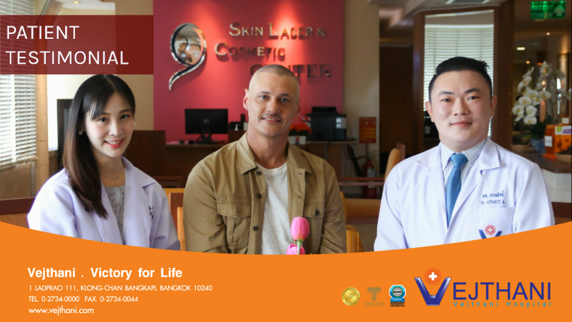 Mr. Daniel Cliut Tauntou, an Australian patient went through Hair Transplant Surgery at Vejthani Hospital. He describes it as “really really well on all levels” to Dr. Chanika Witoonchart (Skin Laser & Cosmetic Center) and Dr. Athasit Amornthanomchoke (Vejthani Q-Life Center).