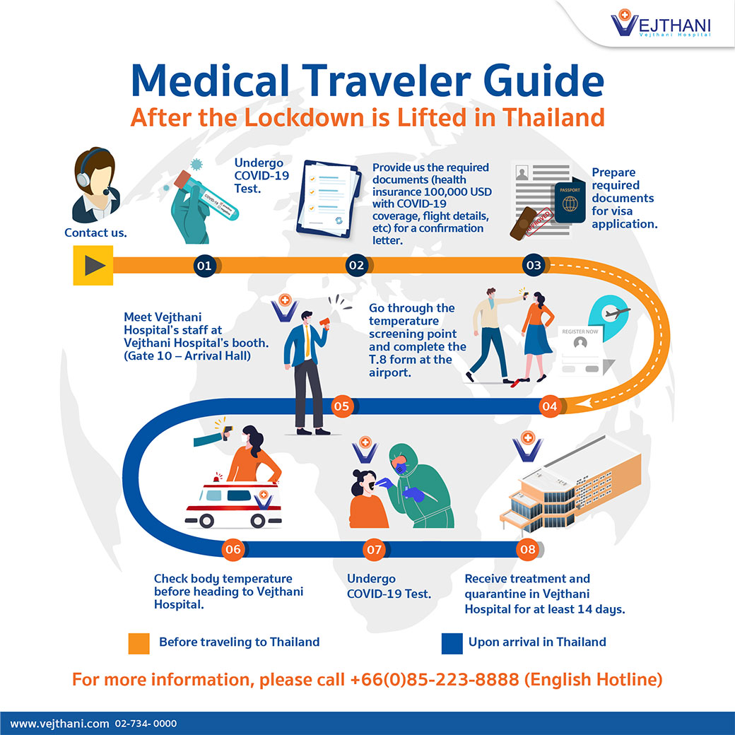 After the lockdown is lifted in Thailand, medical and wellness tourism will be allowed. However, the patients who want to receive treatment in Thailand have to contact Vejthani Hospital and provide necessary documents which includes: