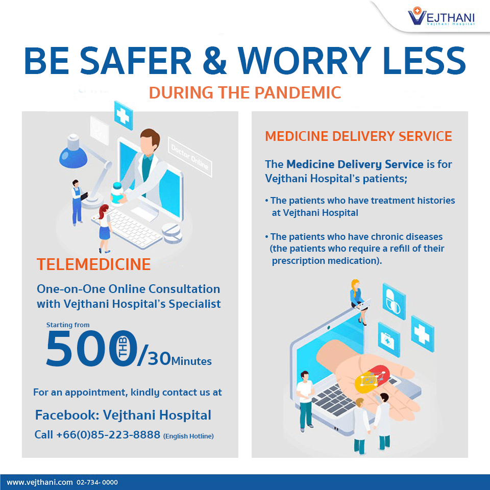 Be Safer and Worry less during this pandemic period. Vejthani Hospital’s doctors are just “One Call Away”. Let us take care of your health by providing One-on-One Online video consultation with our Vejthani Hospital’s specialist doctors for the price starting from 500THB/30 minutes.