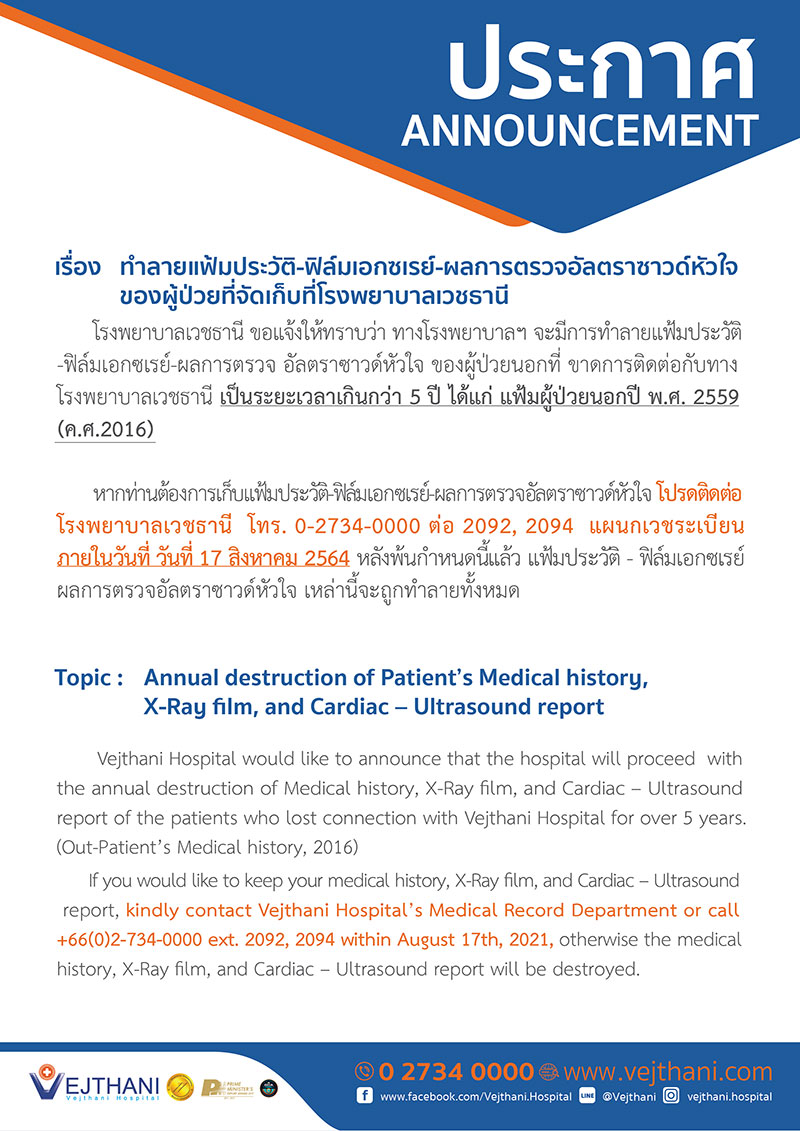 If you would like to keep your medical history, X-Ray film, and Cardiac – Ultrasound report, kindly contact Vejthani Hospital’s Medical Record Department or call +66(0)2-734-0000 ext. 2092, 2094 within August 17th, 2021, otherwise the medical history, X-Ray film, and Cardiac – Ultrasound report will be destroyed