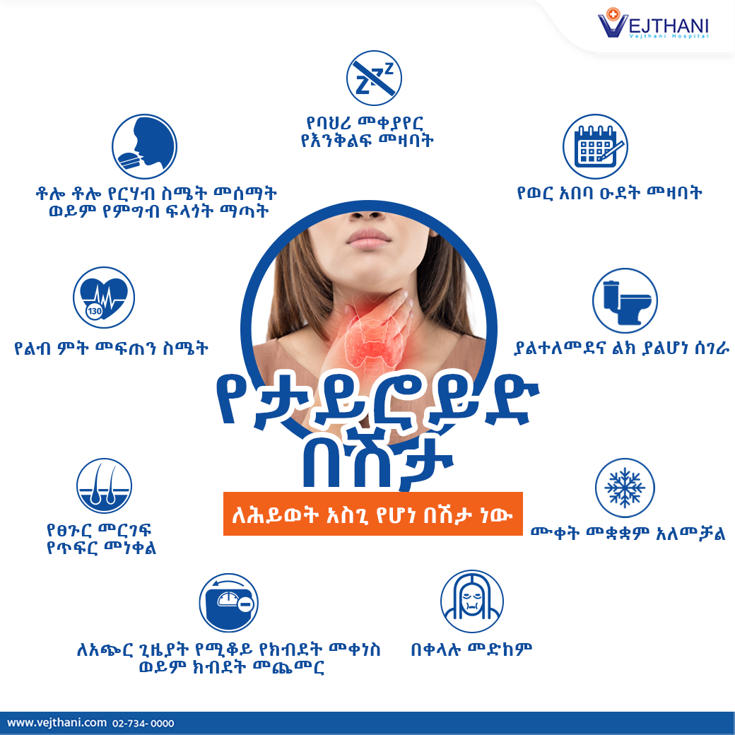 ያልተለመደ የምግብ መፈጨት (metabolism) ችግር ፣ የስሜት መለዋወጥ እና የፀጉር መነቃቀል ያጋጥሙዎታል? እነዚህ የታይሮይድ በሽታ (Thyroid disease) ምልክቶች ናቸው። ለወደፊት ሊከሰቱ የሚችሉ ችግሮችን ቀድሞ ለመከላከል አሁንኑ ምርመራ ማድረግና የሕክምናን አገልግሎት ማግኘት አለብዎት፡፡