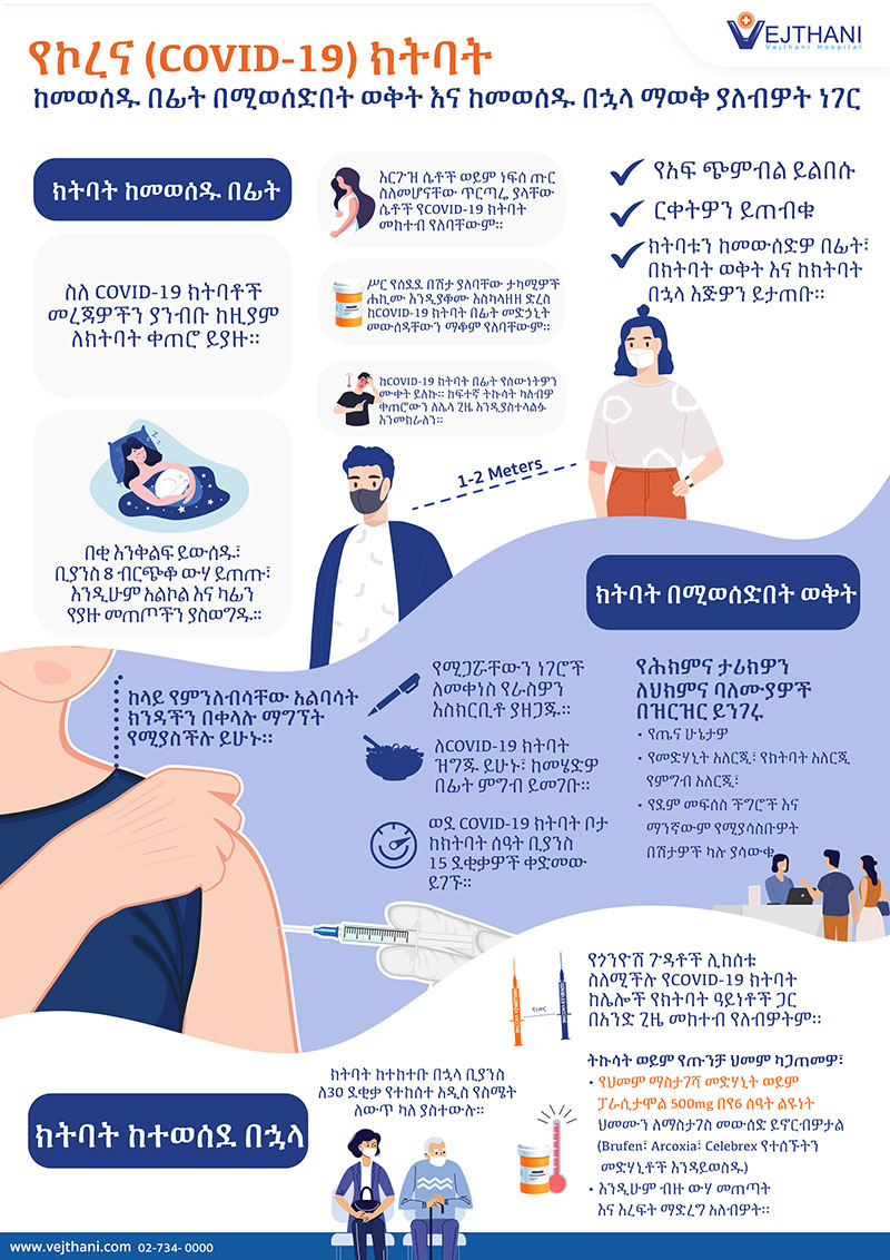 • ወደ COVID-19 ክትባት ቦታ ከክትባት ሰዓት ቢያንስ 15 ደቂቃዎች ቀድመው ይገኙ፡፡