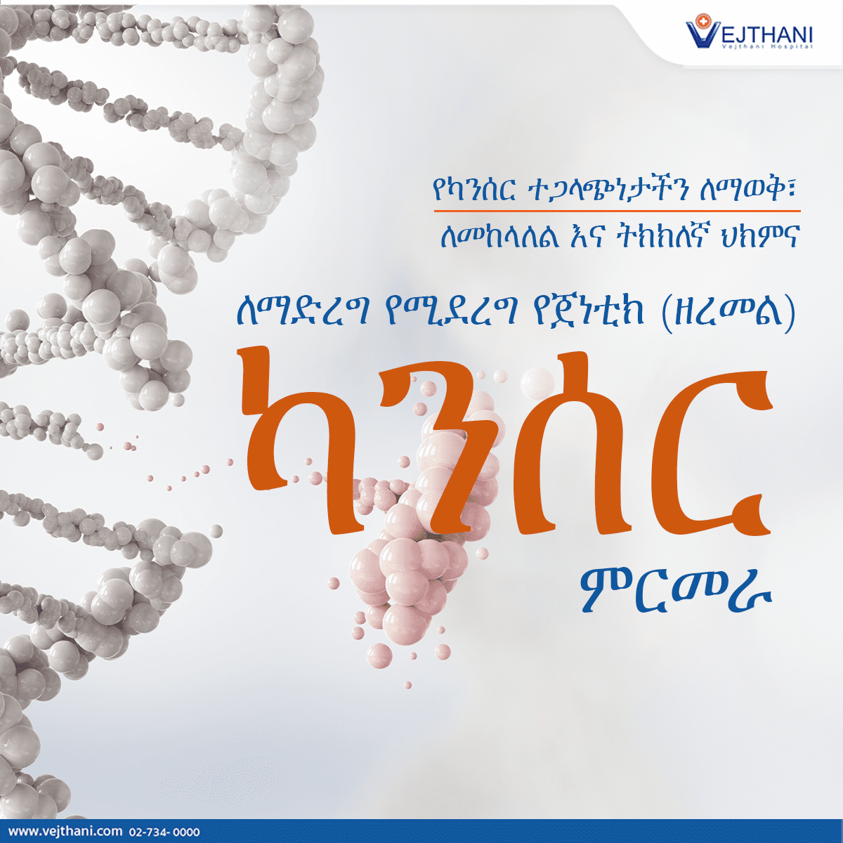 “የካንሰር ቅድመ መከላከል እና ህክምና መዘመን ታካሚዎች በጣም ውጤታማ እና ትክክለኛ ህክምና እንዲያገኙ ብሎም በሰውነት ውስጥ ያሉ ጤነኛ ሴሎችን ሳይጎዱ እና በካንሰር ህክምናው የጎንዮሽ ጉዳት ሳይደርስባቸው ህክምና ማድረግ እንዲችሉ አስችሏል። በቤተሰብ ውስጥ የካንሰር ታሪክ የነበረባቸው እና ሊኖራቸው የሚችለውን በካንሰር የመያዝ እድል ማወቅ ለሚፈልጉ ሰዎች ከዘረመል ምርመራ በኋላ ምንም አይነት ችግር ካልተገኘ ስጋታቸው ይቀረፍላቸዋል። ይሁን እንጂ ችግሩ ከተገኘም ቀድሞ ስለሚታወቅ ለወደፊቱ እቅድ ለማውጣት ይረዳል ሲሉ Dr. Natchadol ያብራራሉ።ለበለጠ መረጃ በቬጂታኒ ሆስፒታል የሚገኘውን የቬጂታኒ ካንሰር ማዕከልን (Life Cancer Center) ይጎብኙ። ስልክ ቁጥር 02-734-0000 Ext. 272 የኢትዮጵያ ደንበኞች አገልግሎት ቁጥር፦(+66)9-090-72560