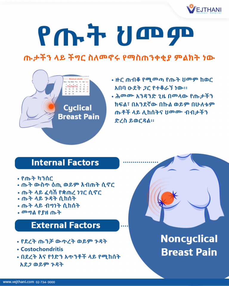 በሴቶች ላይ የሚከሰት የጡት ህመም የጡት ካንሰር (Breast cancer) ተጋላጭ መሆናችን አመላካች ከሆኑ ምልክቶች አንዱ ነው፡፡ ምልክቶች በሚከሰቱበት ጊዜ ህመምተኛው የህመሙን መንስኤ ለማዎቅ በአስቸኳይ ወደ ህክምና መሄድ አለበት፡፡ የጡት ህመም በሁለት ይከፈላል እነሱም:- ዙር ጠብቆ የሚመጣ