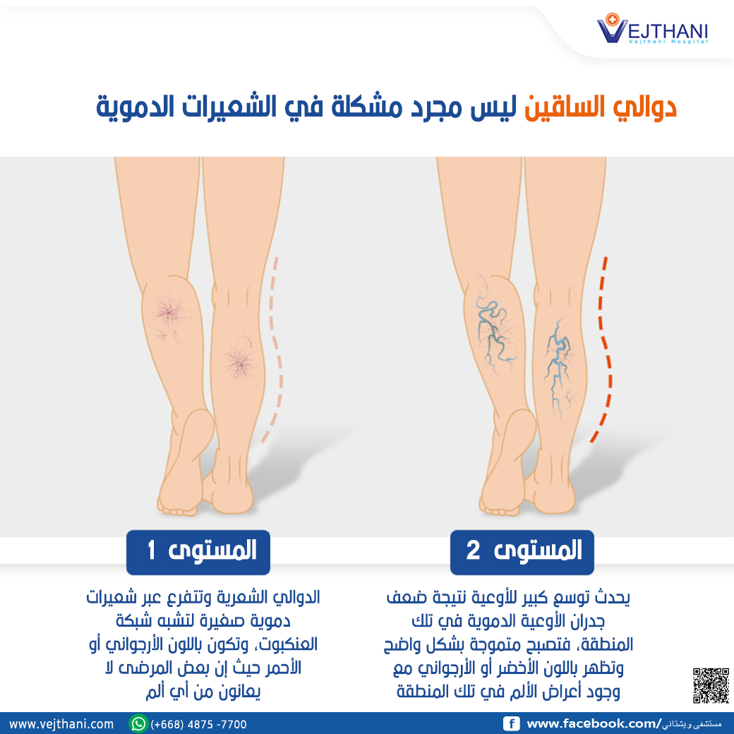 لذا… إذا كنت تعاني من أعراض الدوالي الساقين فقم بزيارة الطبيب المختص لتلقي العلاج المناسب قبل أن تزداد حدة الأعراض المناسب قبل أن تزداد حدة الأعراض مما قد يصعب علاجها أو قد يحدث مضاعفات أثناء العلاج.