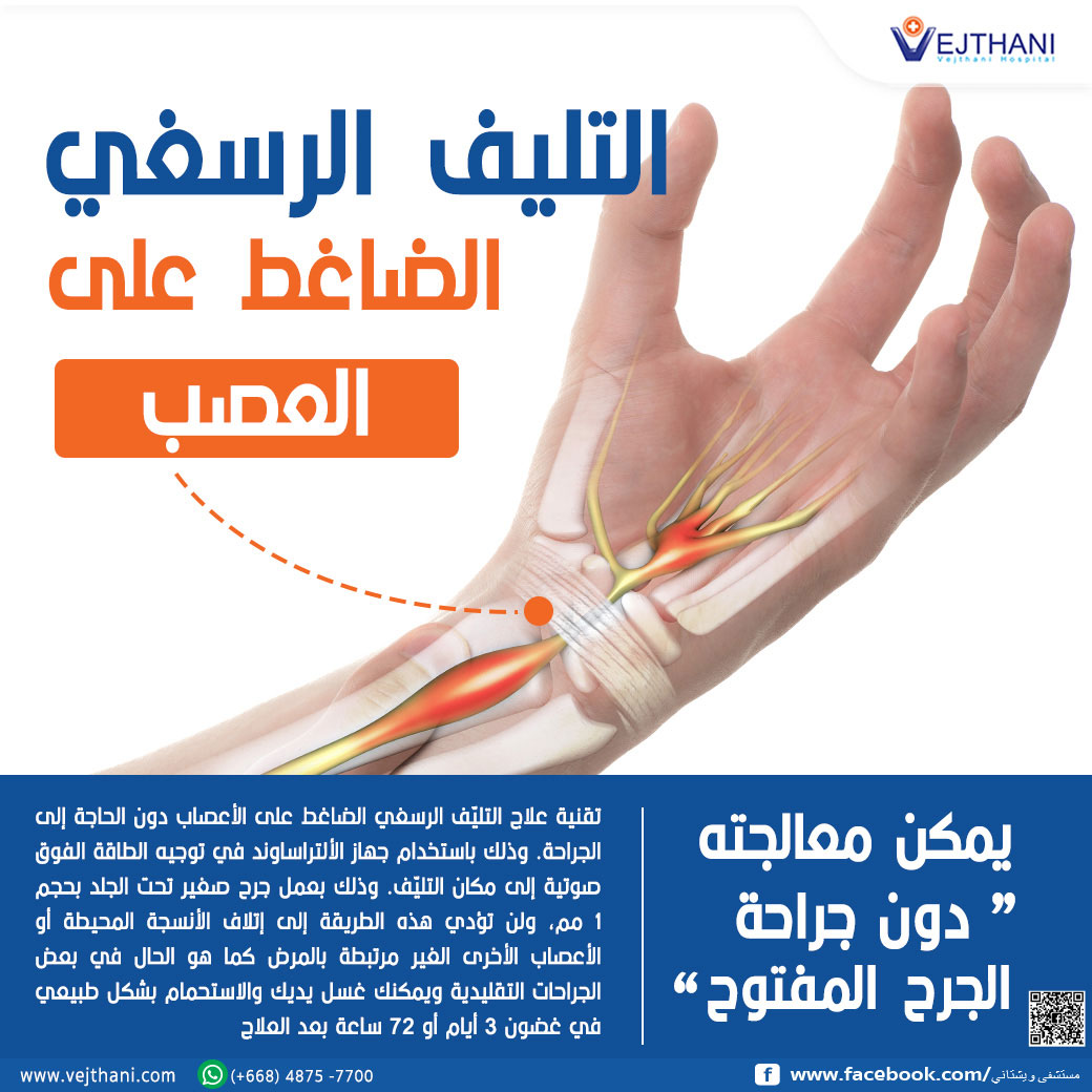 📝..في الوقت الحاضر، هناك تقنية تعمل على علاج التليّف الرسغي الضاغط على الأعصاب دون الحاجة إلى الجراحة. وذلك باستخدام جهاز الألتراساوند في توجيه الطاقة الفوق صوتية إلى مكان التليّف. وذلك بعمل جرح صغير تحت الجلد بحجم 1 مم، ولن تؤدي هذه الطريقة إلى إتلاف الأنسجة المحيطة أو الأعصاب الأخرى الغير مرتبطة بالمرض كما هو الحال في بعض الجراحات التقليدية.