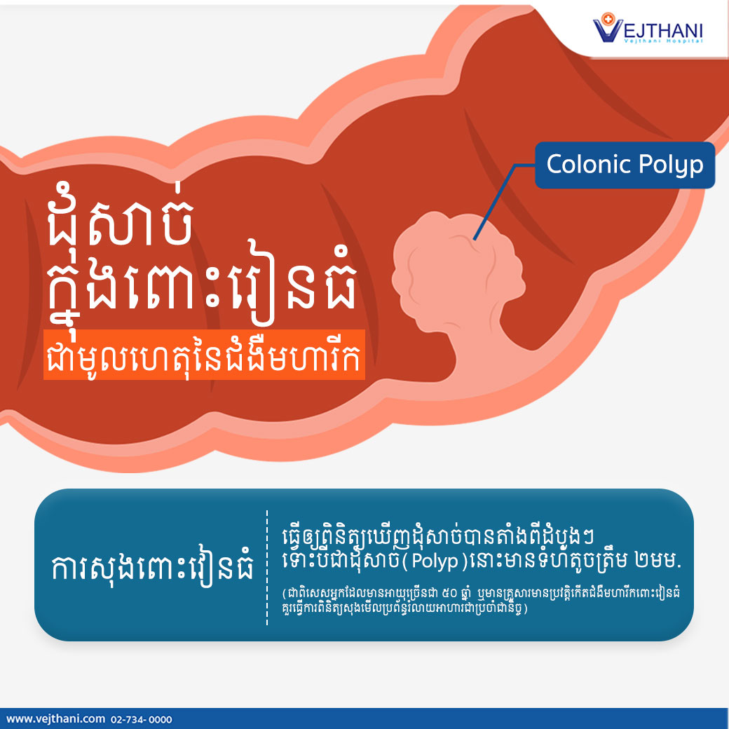 ដោយចំណេះដឹងផ្នែកវេជ្ជសាស្ត្រក្នុងបច្ចុប្បន្ន ធ្វើឲ្យយើងដឹងថាជំងឺមហារីកពោះវៀនធំកើតមកពីដុំសាច់ឬហៅថា Polyp ក្នុងពោះវៀនធំ