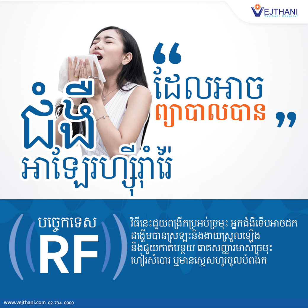 ឬរោគសញ្ញាដែលតឹងច្រមុះនោះកើតបណ្តាលមកពីជាលិកាផ្នែកខាងក្រោមរីកធំ វេជ្ជបណ្ឌិតនឹងណែនាំឲ្យធ្វើព្យាបាលដោយបច្ចេកទេសដែលមានឈ្មោះថា “ RF (Radiofrequency) ឬ ការព្យាបាលដោយរលកវិទ្យុ “