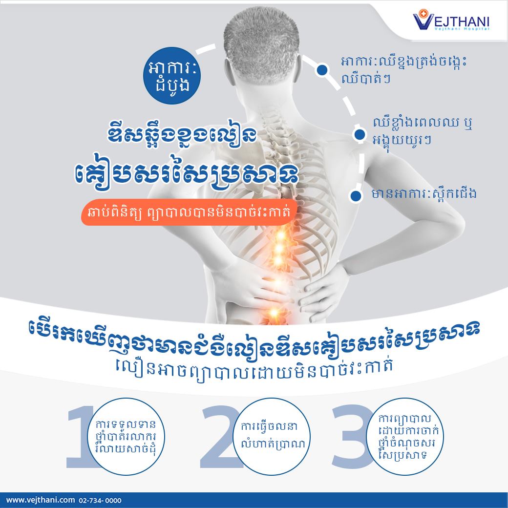 ដូច្នោះហើយប្រសិនជាមានរោគសញ្ញាឈឺឆ្អឹងខ្នងញឹកញាប់ហើយមកជួបពេទ្យតាំងពីដំបូងៗ ការព្យាបាលក៏អាចធ្វើបានងាយនិងមិនចាំបាច់កែបញ្ហាដោយការវះកាត់ឡើយ ក៏បន្តែប្រសិនជាមានរោគសញ្ញានៅក្នុងក្រុមដែលគ្រោះថ្នាក់ដូចជា រោគសញ្ញាឈឺចាក់ពីកឬខ្នងទៅដៃ ឬជើង មានរោគសញ្ញាស្ពឹកដៃ/ជើង មានរោគសញ្ញាខ្សោយកម្លាំងសាច់ដុំដៃ/ជើង ក៏អាចចាំបាច់ត្រូវធ្វើការវះកាត់ ដែលបច្ចុប្បន្នក៏មានបច្ចេកទេសដែលមានភាពត្រឹមត្រូវនិងមានសុវត្ថិភាពខ្ពស់ មិនថាជាការវះកាត់ដោយកាមេរ៉ា MICROSCOPE ឬ ENDOSCOPE ដែលជួយឲ្យមុខរបួសតូចជាងដើម អ្នកជំងឺបាត់បង់ឈាមតិច និងកាត់បន្ថយការរង់របួសសាច់ដុំ អ្នកជំងឺទើបជាសះស្បើយលឿនជាងការវះកាត់ប្រភេទចាស់ ។