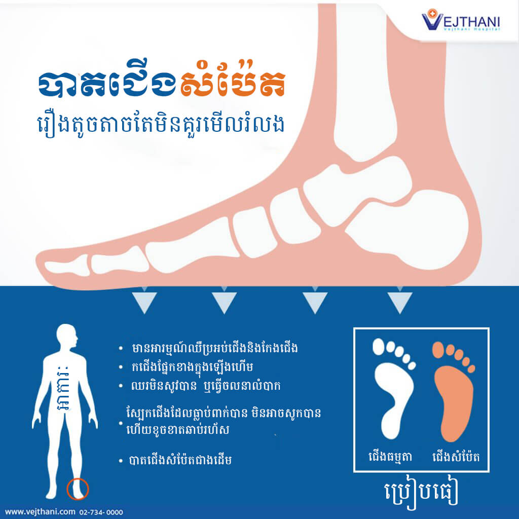ដែលធ្លាប់សង្កេតដែរឬទេថា ពេលដើរច្រើនៗឬប្រើការជើងច្រើនៗ ដែលរោគសញ្ញាឈឺបាតជើងអាចមិនបានកើតបណ្តាលមកពីរលាកបាតជើងតែម្យ៉ាង តែព្រោះមកពីបាតជើងសំប៉ែតជាធម្មតា ហើយបាតជើងបែបនេះគឺជាអ្វី និងបង្កផលប៉ះពាល់ដល់ការរស់នៅតិចច្រើនប៉ុណ្ណា ៗ “ បាតជើងសំប៉ែត – Flat feet “ ដែលកើតលើមនុស្សភាគច្រើនតែងមិនបញ្ចេញសញ្ញាឬរោគសញ្ញាផ្សេងៗ អ្នកជំងឺខ្លះអាចមានអារម្មណ៍ឈឺជាពិសេសបរិវេណប្រអប់ជើង រោគសញ្ញានោះនឹងកាន់តែធ្ងន់ធ្ងរឡើងៗពេលធ្វើសកម្មភាពផ្សេងៗ រួមទាំងកើតរោគសញ្ញាហើមត្រង់កន្លែងកជើងផ្នែកខាងក្នុងទៀតផង ជាទូទៅអ្នកដែលមានបាតជើងសំប៉ែតមិនចាំបាច់ត្រូវមានទទួលការព្យាបាលប្រសិនជាមិនបានរោគសញ្ញាឈឺចាប់បាតជើង