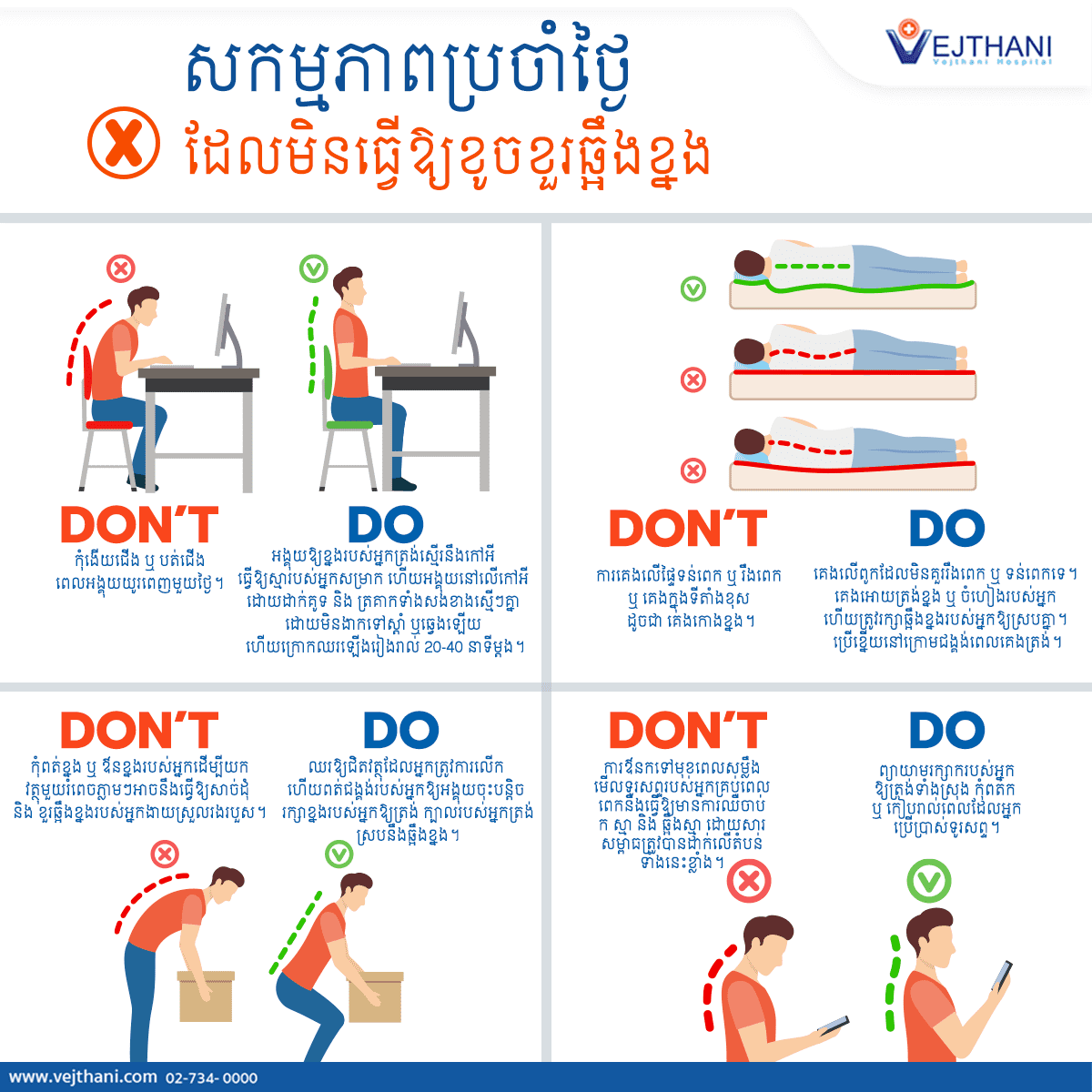 ហាមធ្វើ៖ ងើយជើង ឬ បត់ជើងពេលអង្គុយយូរពេញមួយថ្ងៃនឹងធ្វើឱ្យឈឺខ្នង និង ស្មា។
