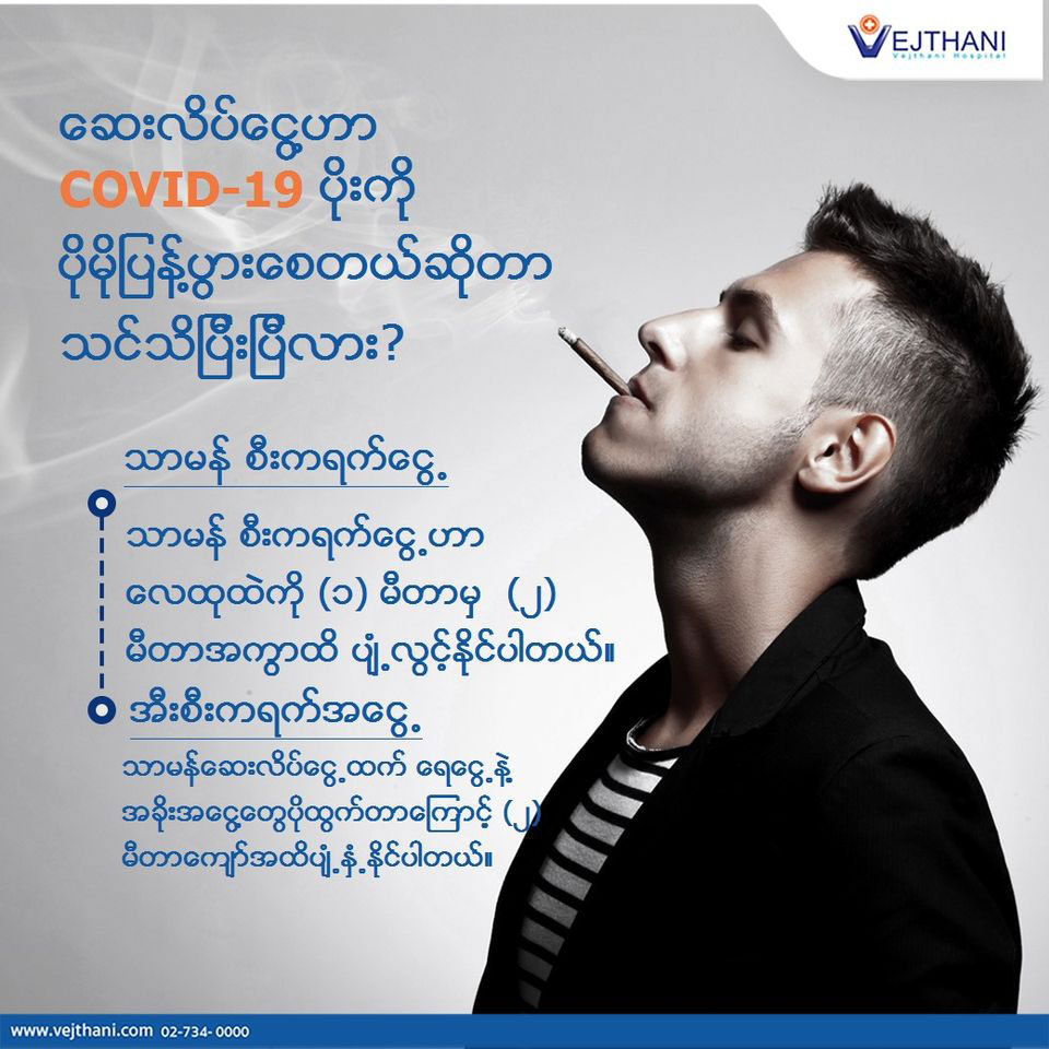 COVID-19 ရွိတဲ့သူတစ္ေယာက္က ေဆးလိပ္ (သို႔) အီးစီးကရက္ကို ရႈရွိက္ေသာက္သုံးလိုက္တဲ့အခါ ခၽြဲသလိပ္နဲ႔ တံေတြးေတြပိုမိုျဖစ္ေပၚလာေစၿပီး COVID-19 ပိုးေတြလဲ တစ္ပါတည္းထြက္ရွိလာနိုင္ပါတယ္။ ေဆးလိပ္ေငြ႕မႈတ္ထုတ္လိုက္တဲ့အခါ COVID-19 ပိုးဟာ ေဆးလိပ္ေငြ႕နဲ႔အတူ ေလထဲကိုပ်ံ႕လြင့္လာပါလိမ့္မယ္။