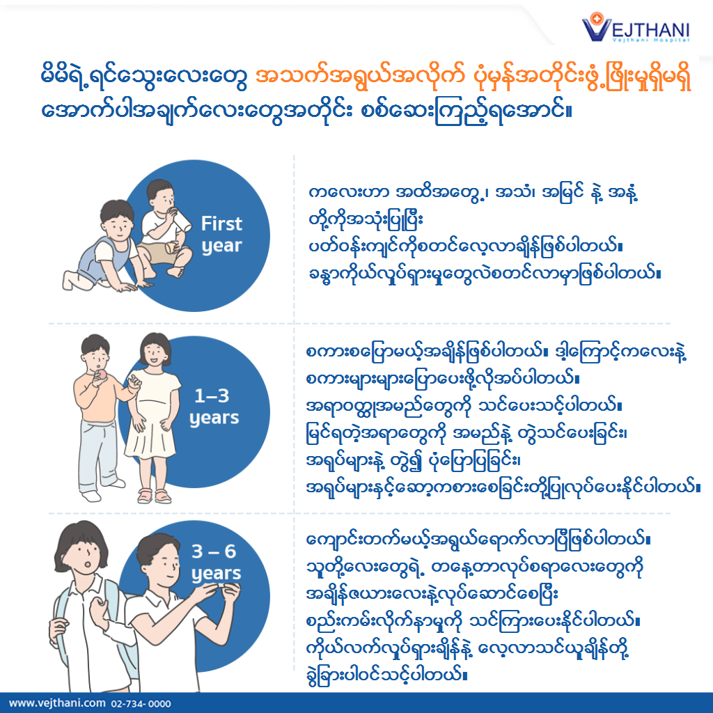 မိမိရဲ့ရင်သွေးလေးတွေ အသက်အရွယ်အလိုက် ပုံမှန်အတိုင်းဖွံ့ဖြိုးမှုရှိ(Child’s Development)မရှိကို အောက်ပါအချက်လေးတွေအတိုင်း စစ်ဆေးကြည့်ရအောင်။
