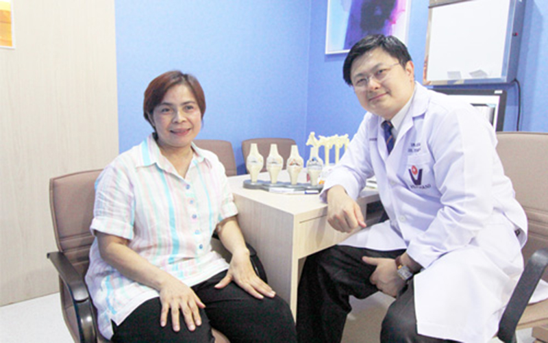 จึงเริ่มที่จะท้อกับการหาหมอว่าหาเท่าไหร่ก็ไม่หายสักที จนในที่สุดได้มาเจอกับคนที่รู้จักได้แนะนำให้มาตรวจกับคุณหมอเปรมเสถียร ศิริธนาพิพัฒน์ ศัลยแพทย์ผู้เชี่ยวชาญด้านกระดูกและข้อ-การผ่าตัดข้อเข่าและข้อสะโพกเทียม ศูนย์ฟื้นฟูข้อเสี่อม โรงพยาบาลเวชธานี เนื่องจากคนที่แนะนำให้มาหาคุณหมอนั้นเคยพาคุณแม่มารักษาและหาย คุณแม่ของเขาสามารถเดินได้ตามปกติ ทำให้เราอยากมาตรวจกับคุณหมอเพราะอยากจะหายบ้าง ไม่อยากทนทุกข์ทรมานกับการปวดขา อีก และเมื่อได้มาตรวจกับคุณหมอและได้เล่าอาการปวดขาให้ฟัง เริ่มต้นคุณหมอได้ตรวจร่างกายและพาไปเอ็กซเรย์ก่อน แล้วนำผลเอ็กซเรย์มาให้คุณหมอดู ซึ่งคุณหมอได้แจ้งว่า อาการเป็นหนักมากอยู่ในระยะการปวดขั้นที่ 3 แล้ว คุณหมอได้อธิบายว่า ถ้าเป็นมากขนาดนี้แล้ว ทานยาก็คงไม่หาย มีวิธีเดียวนั่นคือ การผ่าตัดเปลี่ยนผิวข้อเข่าเทียม และได้อธิบายขั้นตอนต่าง ๆ ให้ฟัง ซึ่งเมื่อฟังแล้วก็ไม่ได้รู้สึกกลัวแต่อย่างใด แต่กลับไว้ใจคุณหมอในการผ่าตัดครั้งนี้ เพราะเราก็อยากจะหายด้วย