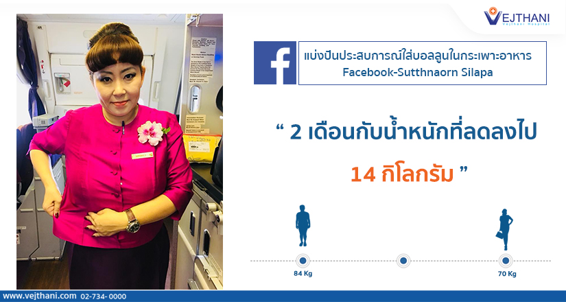 ใช้เวลา 80 วัน น้ำหนักลดลงมาถึง 14 กิโล ประสบการณ์ลดน้ำหนักของคุณสุทณอร ศิลปปรีชา แอร์โฮสเตส ที่ไว้วางใจเลือกใส่บอลลูนลดความอ้วน วิธีการลดความอ้วนแบบไม่ผ่าตัด จากคนไข้มากกว่า 300 รายที่เห็นผล โดยทีมแพทย์โรคระบบทางเดินอาหารและตับ โรงพยาบาลเวชธานี