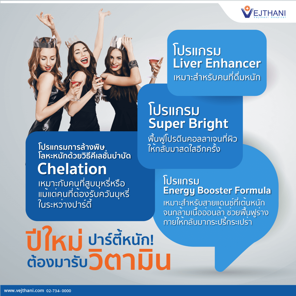 การปาร์ตี้แบบสุดเหวี่ยงหรือต่อเนื่องหลาย ๆ วัน อาจจะส่งผลกระทบต่อสุขภาพได้ไม่แพ้ความเครียดจากการทำงาน ศูนย์ Vejthani Q Life จึงพัฒนาโปรแกรมฟื้นฟูร่างกายด้วยการให้วิตามินและสารอาหารที่สำคัญทางหลอดเลือด ซึ่งเป็นทางเลือกของคนรักสุขภาพเพื่อลดอาการอ่อนล้าของร่างกาย เพิ่มความสดใสให้กับผิวพรรณ เสริมภูมิต้านทาน และช่วยสร้างฮอร์โมนในร่างกาย เป็นการเตรียมความพร้อมให้กับสุขภาพ เพื่อกลับมาทำงานได้อย่างเติมที่หลังปีใหม่ โดยแบ่งโปรแกรมฟื้นฟูร่างกายออกเป็น 4 แบบ ดังนี้