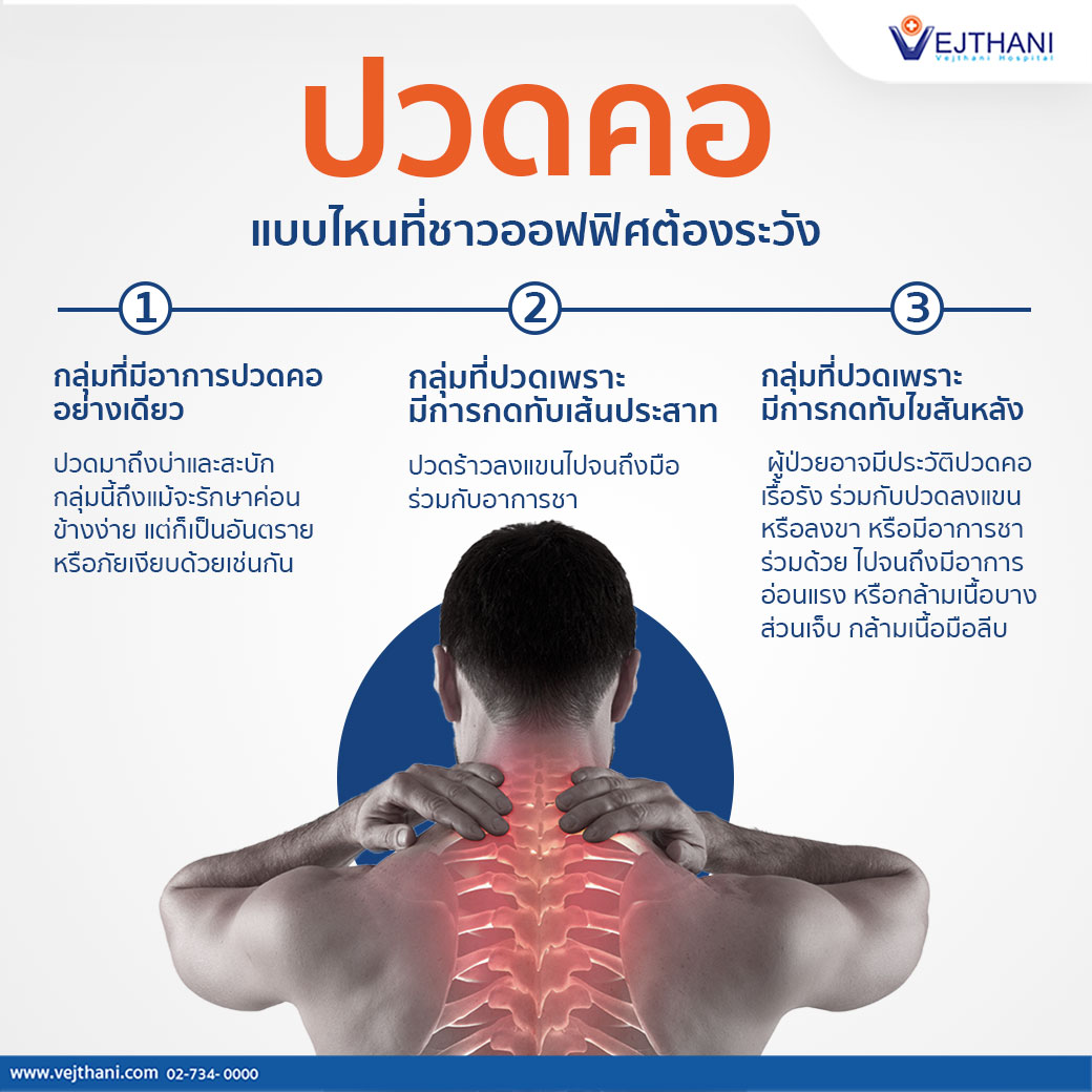 ปวดคอ พบได้ในคนหลากหลายอาชีพ โดยเฉพาะชาวOffice ส่วนใหญ่อยู่หน้าจอคอมพิวเตอร์ มือพิมพ์แป้นพิมพ์ต่อเนื่องหลายชั่วโมง การนั่งอยู่ในท่าเดิมนานๆ เป็นสาเหตุของอาการปวดคอที่ทำให้ผู้ป่วยต้องมาพบแพทย์บ่อยมาก อาจปวดแบบเป็นๆ หายๆ หรือปวดเรื้อรัง ถ้าอาการปวดมาจากกล้ามเนื้อจะไม่ค่อยก่อปัญหาอะไรมาก แต่ถ้าปวดรุนแรงมากเพราะหมอนรองกระดูกสันหลังบริเวณกระดูกต้นคอเสื่อม แล้วเคลื่อนไปทับเส้นประสาท หรือไขสันหลัง อาการปวดชนิดนี้นับว่าเป็นอันตราย โดยสามารถแบ่งได้ 3 กลุ่มดังนี้