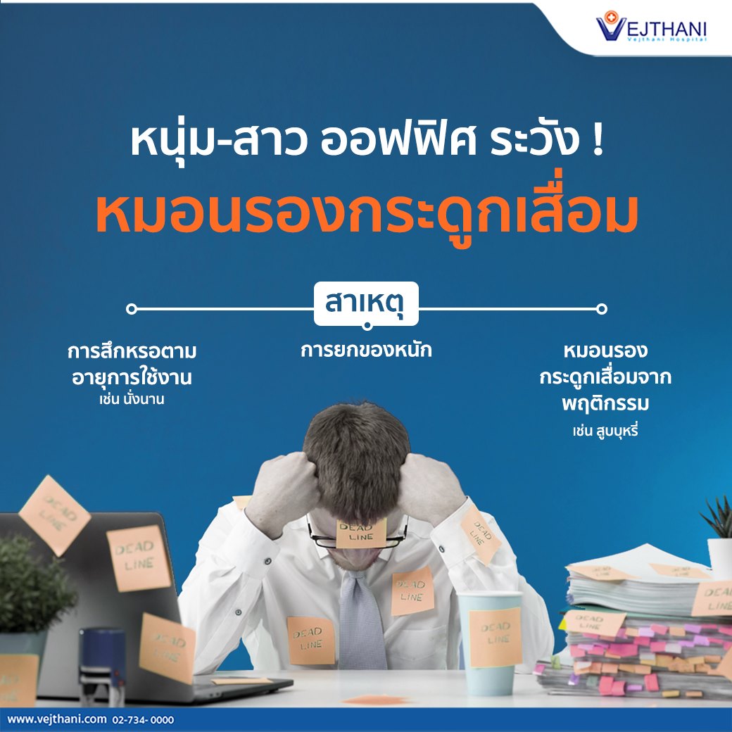 ปวดหลัง ! เสียงบ่นที่พบได้บ่อยของชาวออฟฟิศที่ต้องนั่งทำงานหน้าคอมฯ นาน ๆ ซึ่งอาการปวดหลังเรื้อรังนั้นพบมากขึ้นในทุกช่วงอายุ ตั้งแต่ 25-50 ปี อีกทั้งยังพบว่ามีอัตราการเกิดภาวะหมอนรองกระดูกเสื่อมสูงที่สุด โดยมีสาเหตุดังนี้