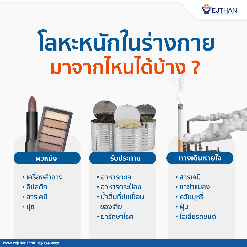 ในแต่ละวันทุกคนมีความเสี่ยงที่จะได้รับสารพิษหรือสารโลหะหนัก ไม่ว่าจะเป็นสารหนู ปรอท ตะกั่ว โครเมียม แคตเมียม โคบอลท์ นิเกิล แมงกานิส และอลูมิเนียม ทั้งจากฝุ่น ควันจากท่อไอเสีย เครื่องสำอาง อาหารทะเล อาหารกระป๋อง หรือแม้แต่ยาบางชนิด โดยสารโลหะหนักจะเข้าไปสะสมอยู่ตามผนังหลอดเลือดหรือตกค้างในเลือด และก่อให้เกิดอาการต่าง ๆ ดังนี้