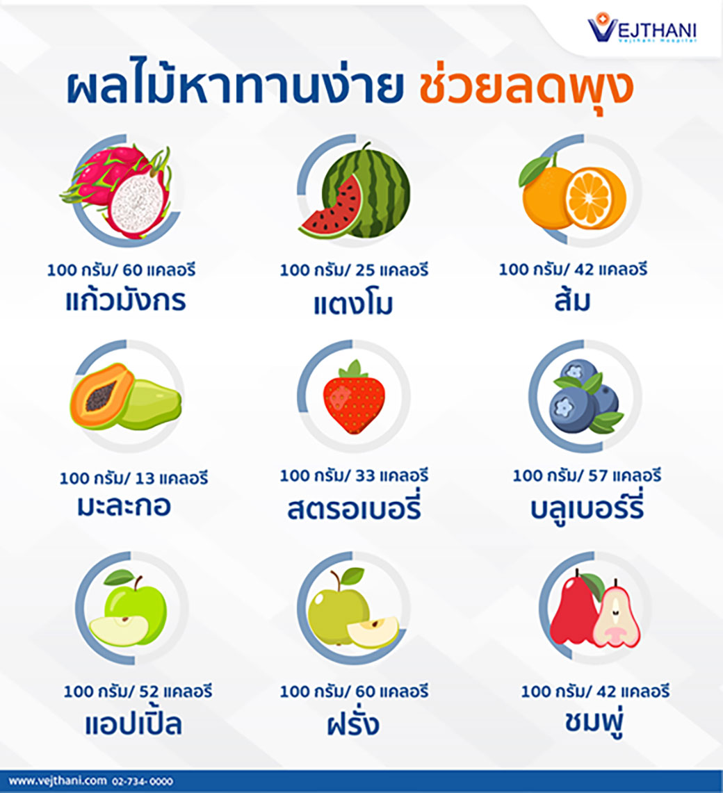 - ฝรั่ง 100 กรัม ให้พลังงาน 60 แคลอรี มีวิตามินซีสูง และช่วยให้อิ่มท้อง