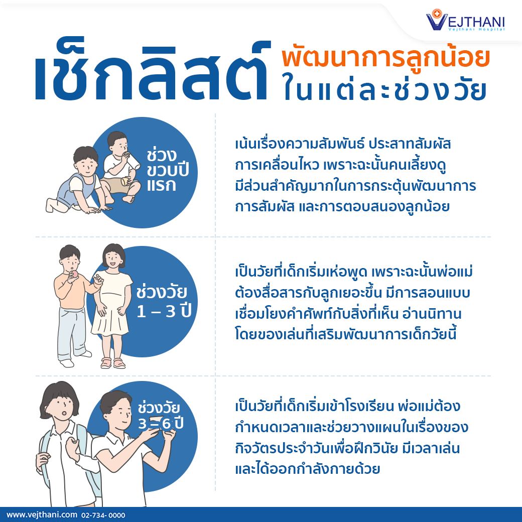 เด็กในแต่ละวัย จะมีพัฒนาการที่แตกต่างกันออกไป ทั้งในด้านการทำงานของกล้ามเนื้อมัดใหญ่ การทำงานของกล้ามเนื้อมัดเล็ก การสื่อสาร และการช่วยเหลือตัวเอง ซึ่งพ่อแม่ควรสังเกตพัฒนาการและพฤติกรรมของลูกน้อยอย่างสม่ำเสมอโดยในแต่ละช่วงวัย ควรสังเกตพัฒนาการของลูกน้อย ดังนี้