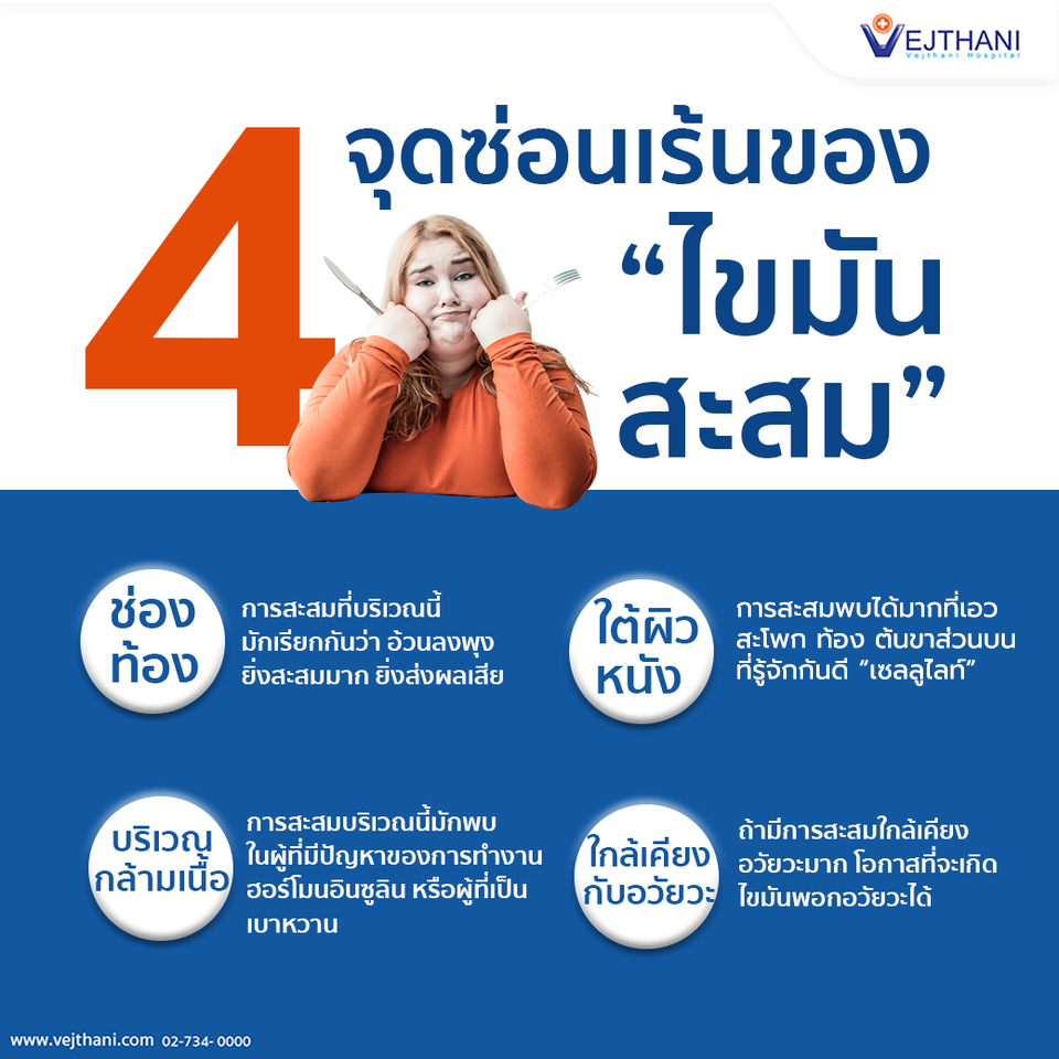 “ไขมัน” จะมีประโยชน์ ต่อเมื่อร่างกายได้รับในปริมาณที่พอดี แต่ถ้าเมื่อไหร่ที่ได้รับมากเกินไป จะเกิดการสะสมของไขมันตามจุดต่าง ๆ ในร่างกาย ซึ่งจุดสำคัญที่มักเกิดการสะสม มีดังนี้