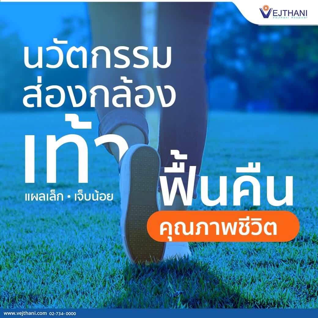 การผ่าตัดส่องกล้องรักษาโรคในเท้าและข้อเท้า สามารถใช้รักษาโรคอะไรได้บ้างสามารถผ่าตัดรักษาในโรคเอ็นร้อยหวายฉีกขาด โดยจะทำการเย็บซ่อมแซมเอ็นร้อยหวายที่ฉีกขาดผ่านกล้อง โรคแผลเป็นและผังผืดในข้อเท้า ที่มักจะเกิดอุบัติเหตุข้อเท้าพลิกบ่อย ๆ ซึ่งผู้ป่วยจะรู้สึกปวดและขัดในข้อเท้าในเวลาเดิน โดยเฉพาะการขึ้นลงบันได ก็สามารถผ่าตัดผ่านกล้องได้ กระดูกอ่อนที่ข้อเท้ามีแผลเป็น ซึ่งจะทำให้มีอาการปวด บวม ในข้อเท้า โดยเฉพาะเวลาเดินมาก ๆ และเป็นสาเหตุหนึ่งที่ทำให้เกิดโรคข้อเท้าเสื่อม แพทย์ก็จะส่องกล้องเข้าไป เจาะกระตุ้นกระดูกเพื่อให้เกิดการสร้างกระดูกอ่อนขึ้นมาใหม่ทดแทน กระดูกข้อเท้าและข้อใต้เท้าเสื่อม