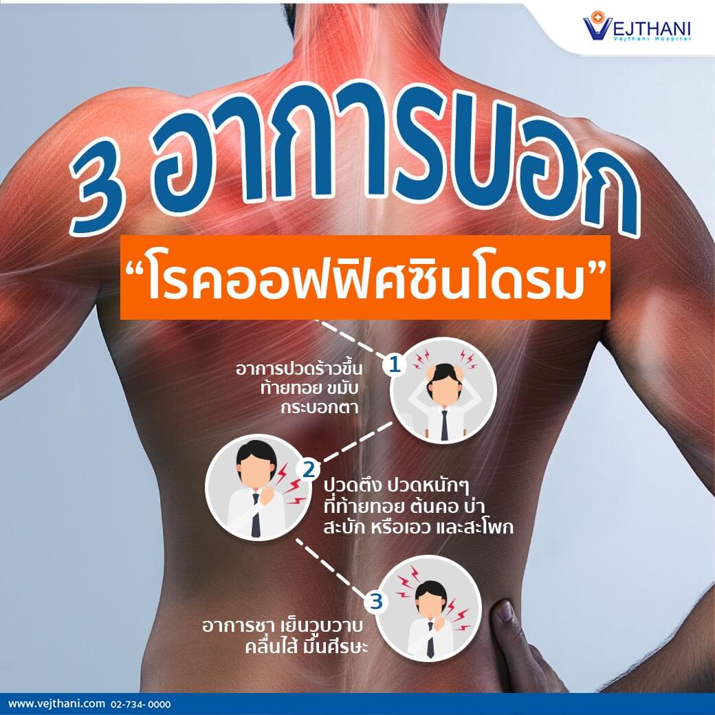 โดยพบได้บ่อยในกล้ามเนื้อบริเวณท้ายทอย ต้นคอ บ่า และสะบักหากละเลย ปล่อยทิ้งไว้ไม่รีบรักษา สามารถนำไปสู่โรคที่รุนแรงมากขึ้น เช่น กระดูกต้นคอและหมอนรองกระดูกเสื่อมกดทับเส้นประสาท โดยอาการของออฟฟิศซินโดรมที่พบบ่อย ได้แก่