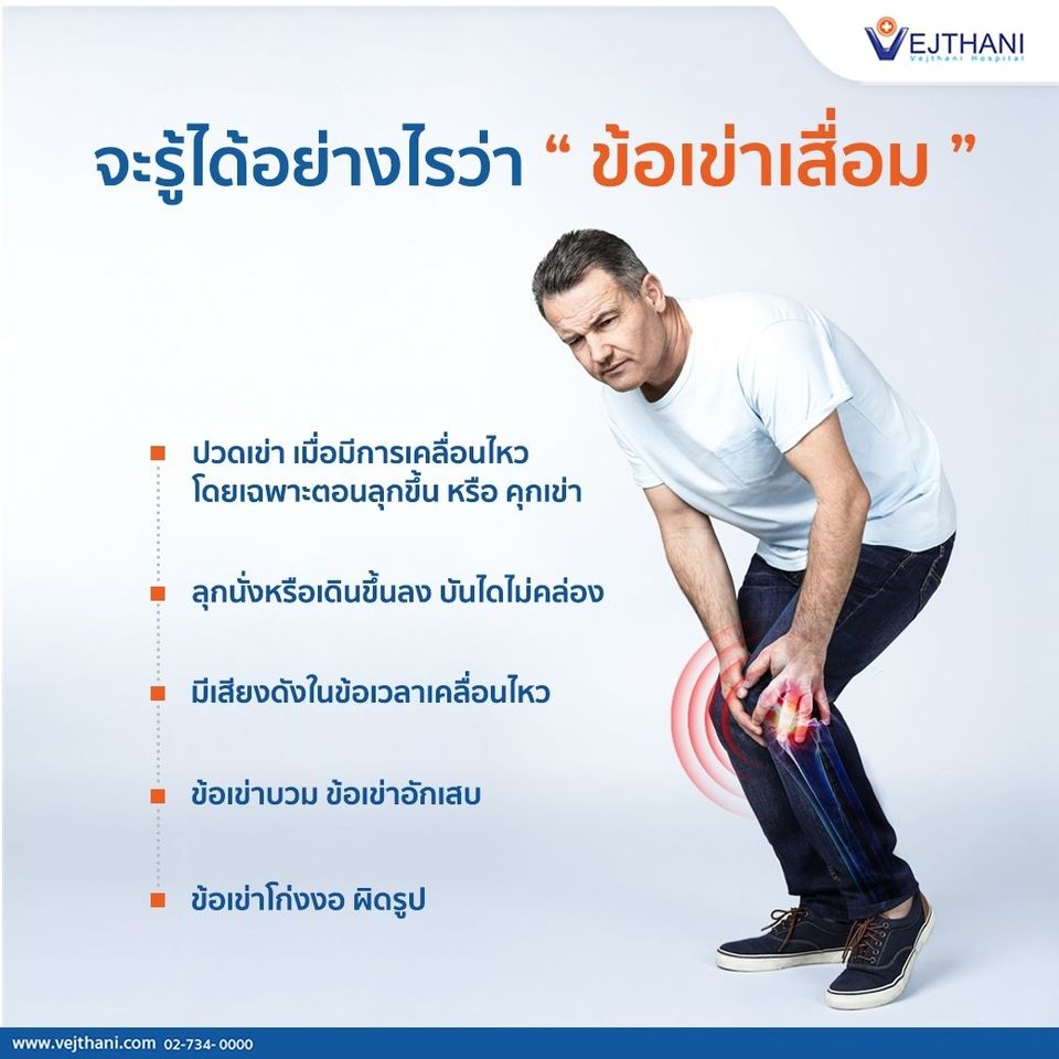 - ปวดเข่า เมื่อมีการเคลื่อนไหว โดยเฉพาะตอนลุกขึ้น หรือ คุกเข่า