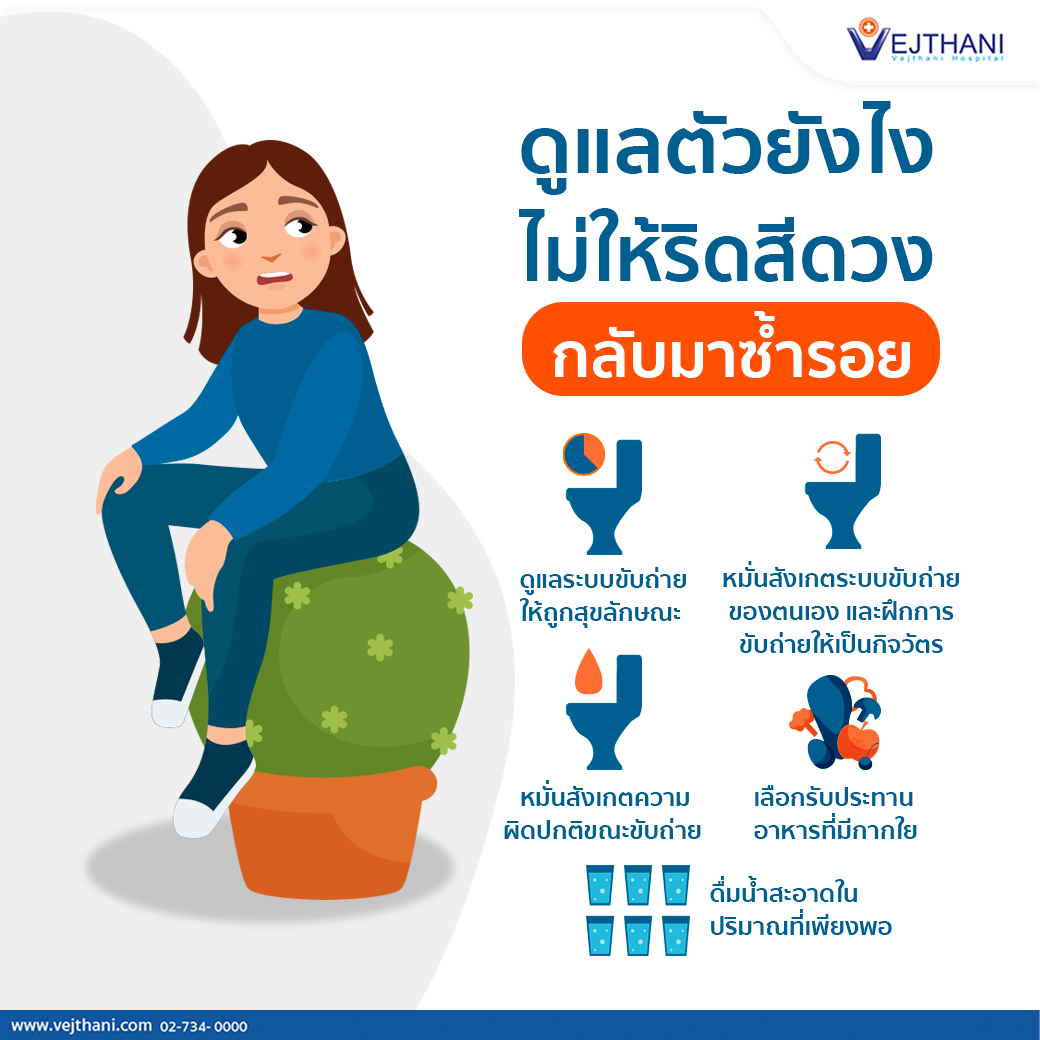 - หมั่นสังเกตความผิดปกติขณะขับถ่าย เช่น ถ่ายเป็นเลือด เป็นต้น และให้รีบมาพบแพทย์ เพื่อรักษาตั้งแต่เนิ่นๆ