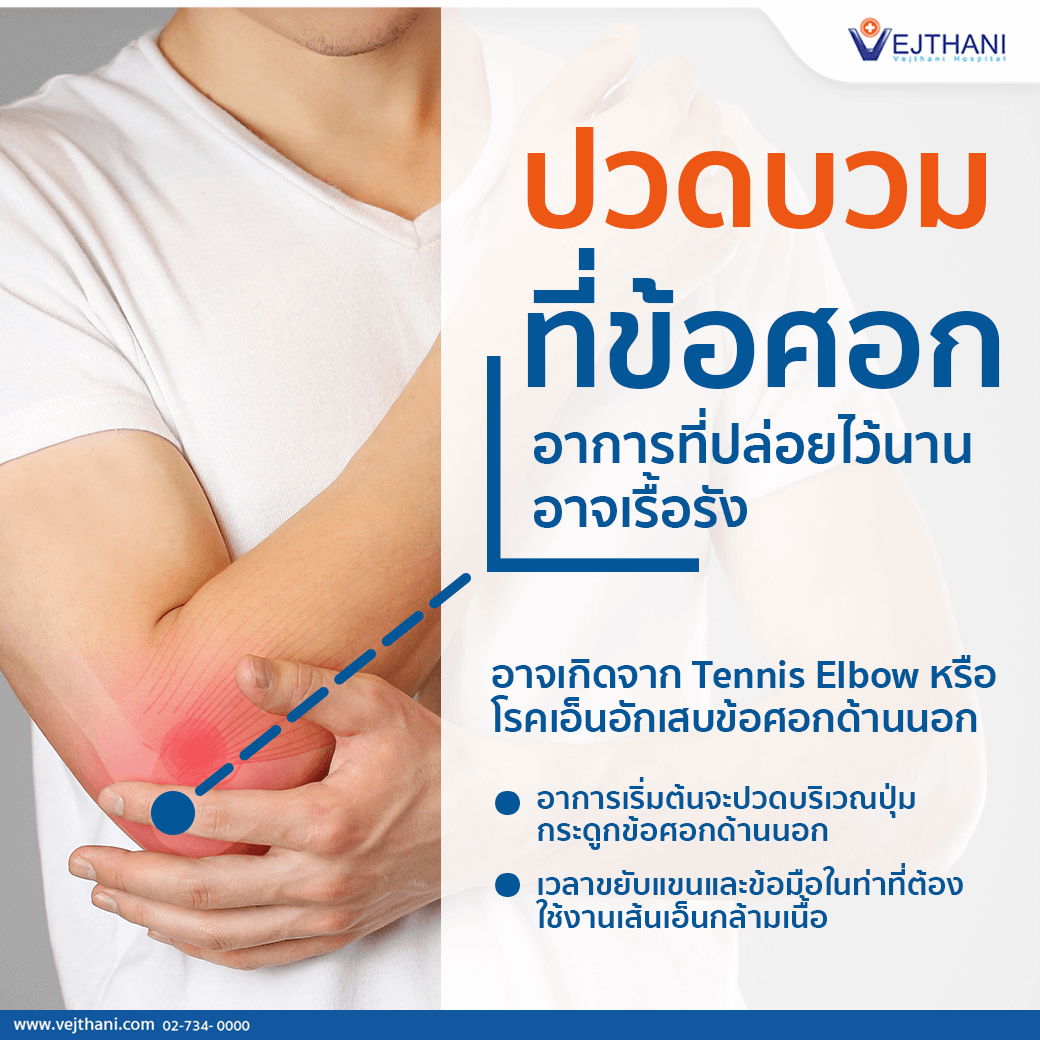 การบาดเจ็บที่ข้อศอกไม่ได้พบแค่เพียงนักกีฬาเท่านั้น แต่คนทั่วไปที่ใช้งานเหยียดข้อศอกหรือกระดกข้อมือในท่าเดิม ๆ ซ้ำ ๆ รวมถึงการวางข้อมือและข้อศอกไม่เหมาะสมในการทำงาน ก็อาจทำให้เอ็นและกล้ามเนื้อข้อศอกบาดเจ็บได้เช่นกัน หากไม่รีบรักษา อาจลุกลามจนมีอาการปวดเรื้อรังได้ Tennis Elbow หรือโรคเอ็นอักเสบข้อศอกด้านนอก เป็นสาเหตุของอาการปวดข้อศอกที่พบได้บ่อย เกิดจากการอักเสบของเอ็นกล้ามเนื้อที่มาเกาะตรงปุ่มกระดูกข้อศอกด้านนอก (Lateral epicondyle)