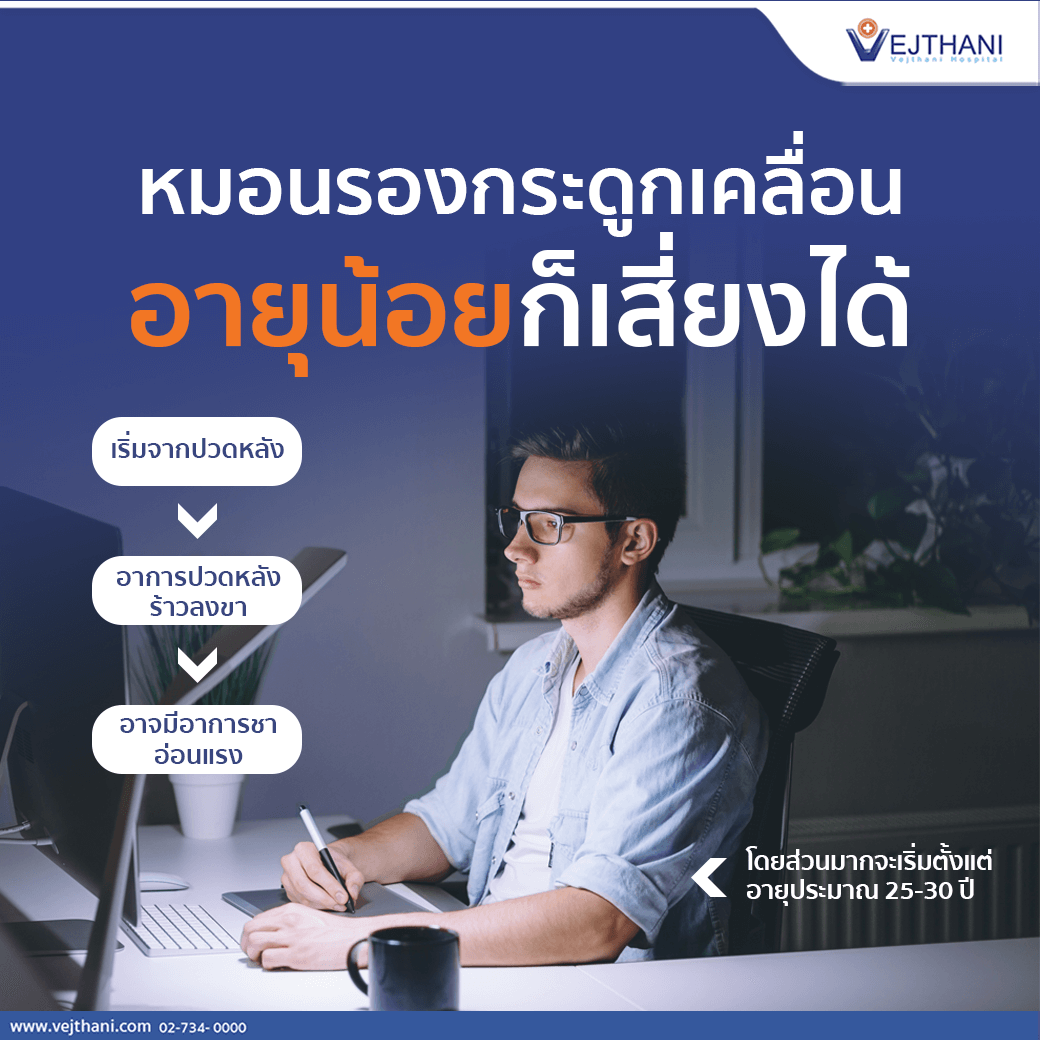 โรคหมอนรองกระดูกเคลื่อน (Lumbar Disc Herniation) เป็นโรคที่พบบ่อยในคนที่หมอนรองกระดูกสันหลังเสื่อม เพราะเมื่ออายุมากขึ้นหมอนรองกระดูกซึ่งเป็นหนึ่งในข้อต่อของกระดูกสันหลังจะเริ่มเสื่อมตามอายุ โดยส่วนมากจะเริ่มที่อายุประมาณ 25-30 ปี ซึ่งบางคนเมื่อหมอนรองกระดูกสันหลังเสื่อม จะมีเนื้อเยื่อหุ้มหมอนรองกระดูกฉีกแยกจนทำให้หมอนรองกระดูกเคลื่อนออกมาและอาจกดทับเส้นประสาท