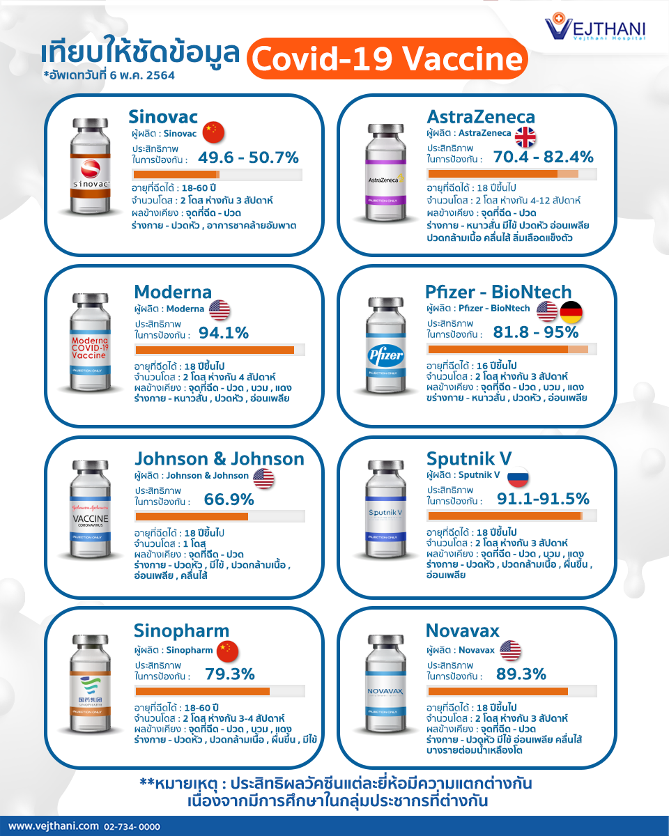 ประสิทธิผลวัคซีน COVID – 19 แต่ละยี่ห้อไม่สามารถนำมาเปรียบเทียบกันได้ เนื่องจากมีการศึกษาในกลุ่มประชากรที่แตกต่างกัน โดยวัคซีน COVID – 19 ทุกชนิดมีศักยภาพในการลดอาการเจ็บป่วยที่รุนแรง ลดการนอนโรงพยาบาล และลดโอกาสในการเสียชีวิตของผู้ป่วย ซึ่งการที่ได้รับวัคซีนเร็วที่สุด ไม่รอคอยวัคซีนเฉพาะบางชนิด จะทำให้ประเทศไทยเกิดภูมิคุ้มกันหมู่และช่วยยับยั้งการระบาดของเชื้อไวรัสได้