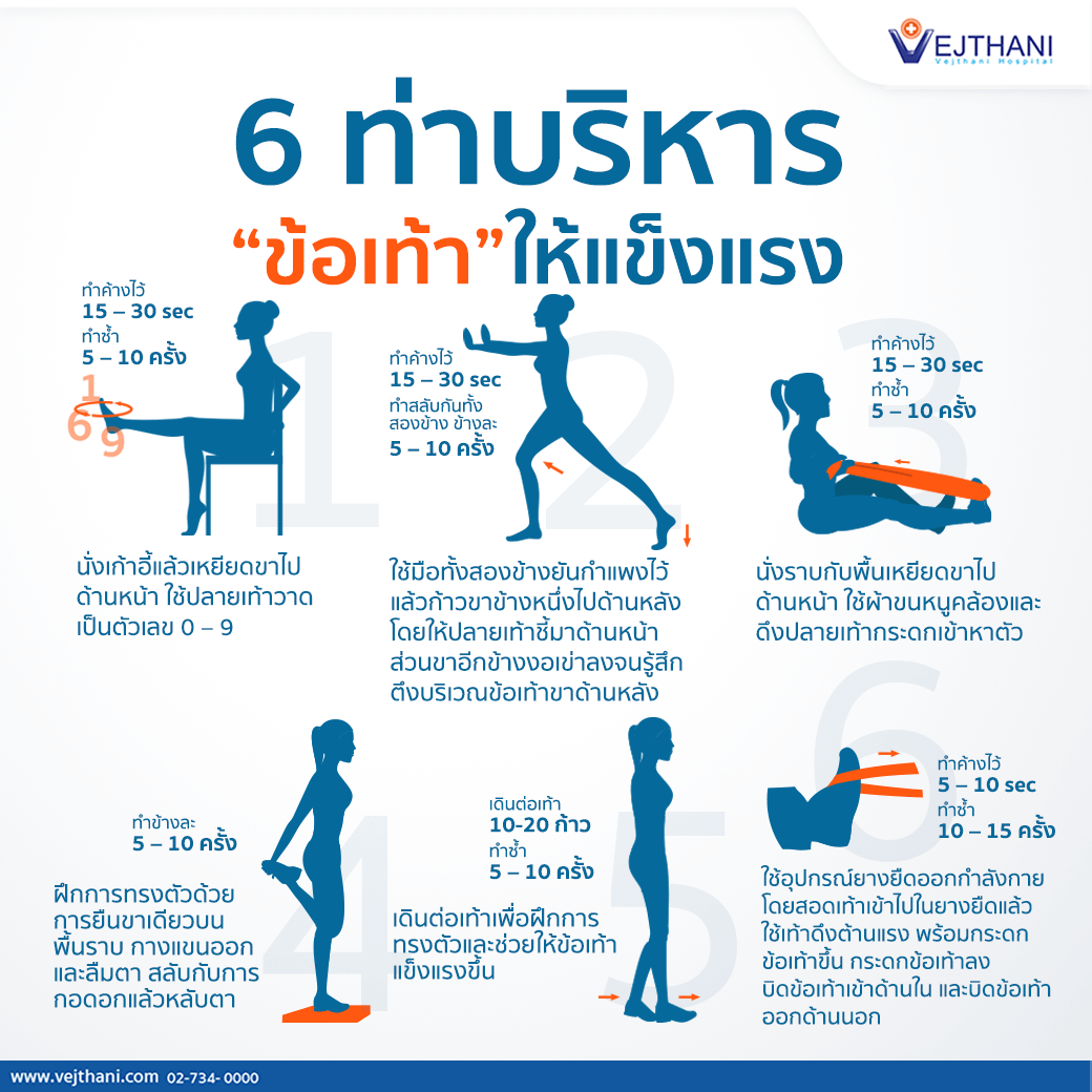 1. นั่งเก้าอี้แล้วเหยียดขาไปด้านหน้า ใช้ปลายเท้าวาดเป็นตัวเลข 0 – 9 ในอากาศ เพื่อให้ข้อเท้าขยับในทุกทิศทาง ทำซ้ำ 2-3 รอบ บริหารวันละ 2-3 ครั้ง
