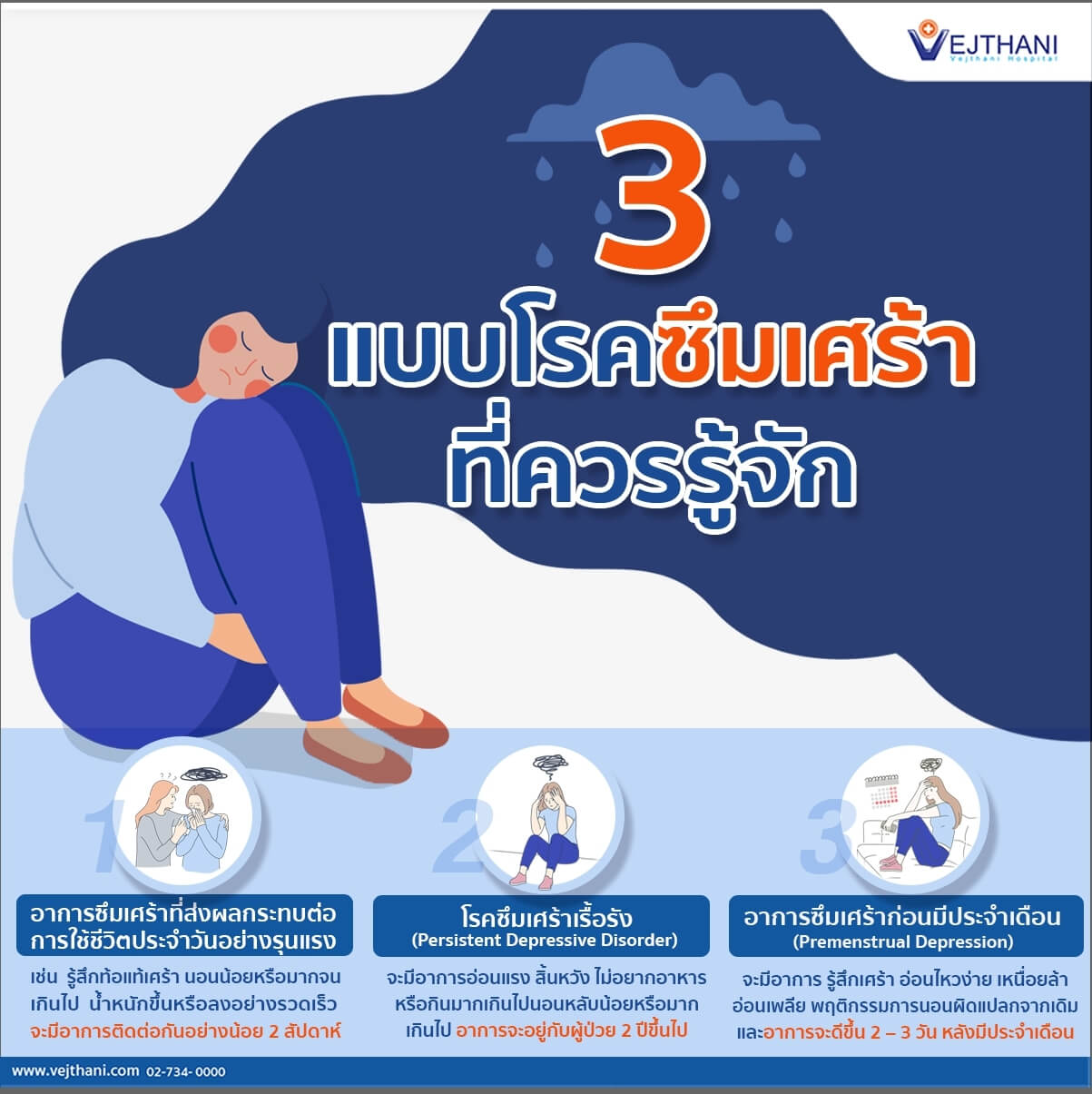 ทั้งนี้ยังพบอาการซึมเศร้าในภาวะอื่น ๆ ได้อีก เช่น ภาวะซึมเศร้าหลังคลอด ภาวะซึมเศร้าจากการใช้สารเสพติด ภาวะซึมเศร้าจากปัญหาโรคทางกายหรือสมองอื่น ๆ เป็นต้นไม่ว่าจะเป็นปัญหาซึมเศร้าประเภทไหนก็ตาม จำเป็นต้องปรึกษาและได้รับการรักษาอย่างถูกวิธีจากแพทย์เฉพาะทาง เพราะหากปล่อยไว้อาจทำให้ผู้ป่วยมีอาการรุนแรงขึ้นและนำไปสู่การสูญเสียได้