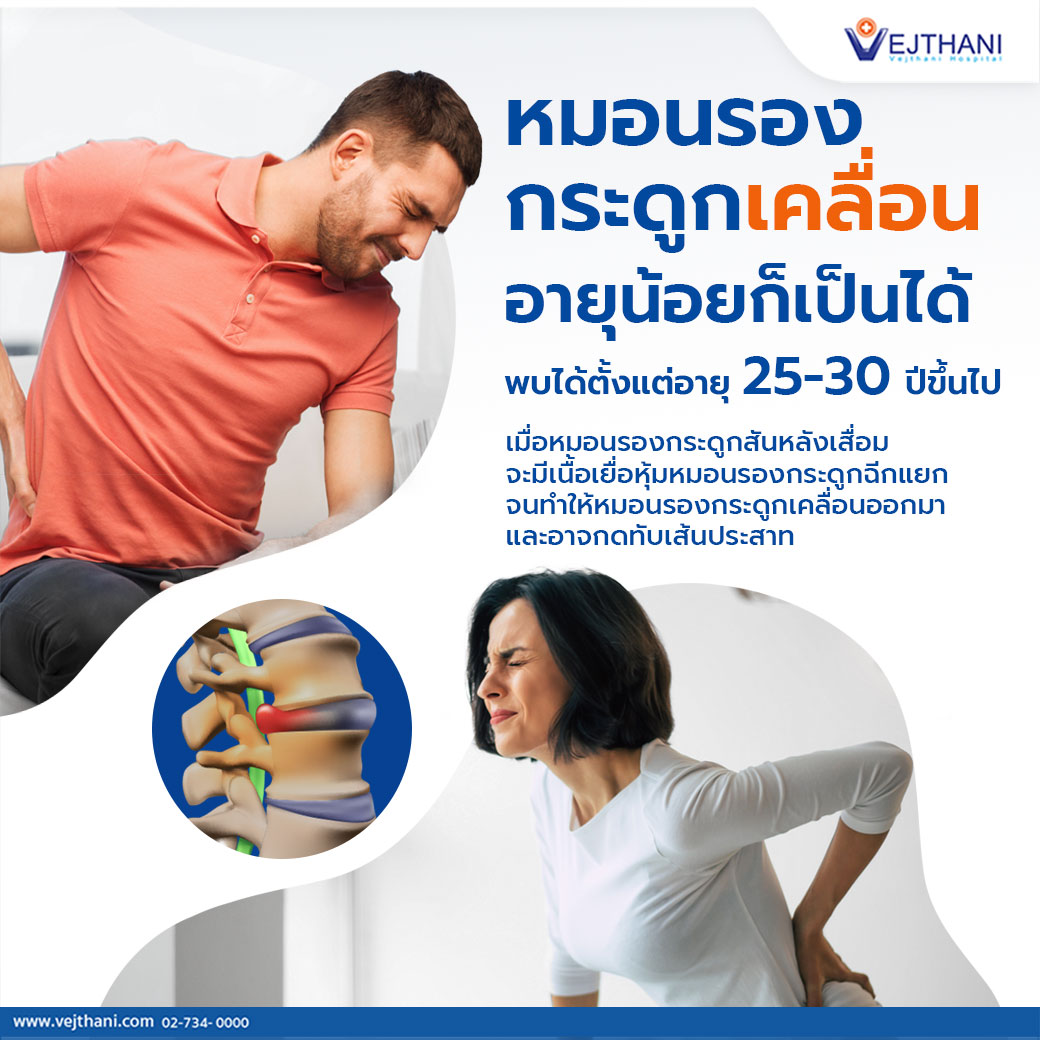 โรคหมอนรองกระดูกเคลื่อน (Lumbar Disc Herniation) เป็นโรคที่พบบ่อยในคนที่หมอนรองกระดูกสันหลังเสื่อม เพราะเมื่ออายุมากขึ้นหมอนรองกระดูกซึ่งเป็นหนึ่งในข้อต่อของกระดูกสันหลังจะเริ่มเสื่อมตามอายุ โดยส่วนมากจะเริ่มที่อายุประมาณ 25-30 ปี ซึ่งบางคนเมื่อหมอนรองกระดูกสันหลังเสื่อม จะมีเนื้อเยื่อหุ้มหมอนรองกระดูกฉีกแยกจนทำให้หมอนรองกระดูกเคลื่อนออกมาและอาจกดทับเส้นประสาท ส่วนใหญ่จะมีอาการปวดหลังนำมาก่อนแล้วตามด้วยอาการปวดหลังร้าวลงขา และอาจมีอาการชา อ่อนแรง หรือขับถ่ายผิดปกติร่วมด้วย โดยอาการมักสัมพันธ์กับกิจกรรมและการใช้งานของหลัง