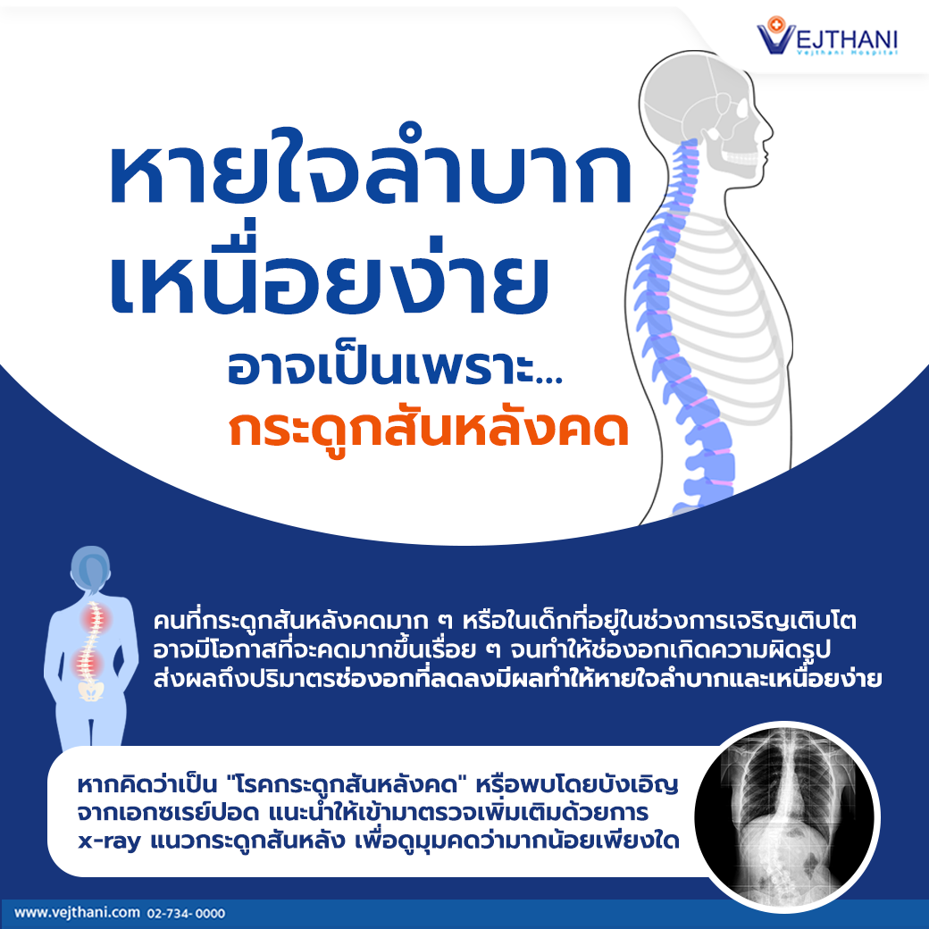 - แต่ในคนที่กระดูกสันหลังคดมาก ๆ หรือในเด็กที่อยู่ในช่วงการเจริญเติบโต อาจมีโอกาสที่จะคดมากขึ้นเรื่อย ๆ จนทำให้ช่องอกเกิดความผิดรูป ส่งผลถึงปริมาตรช่องอกที่ลดลง มีผลทำให้หายใจลำบากและเหนื่อยง่าย หากปล่อยไว้ไม่รักษา จะเป็นอันตรายรุนแรงได้