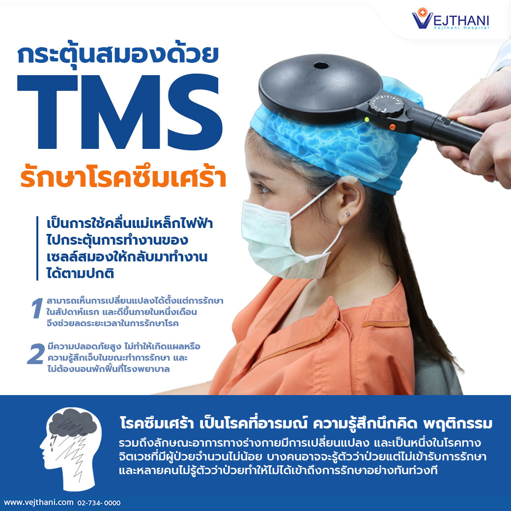 ปัจจุบันมีเทคโนโลยีที่เป็นทางเลือกในการรักษาโรคซึมเศร้าด้วยเครื่องกระตุ้นสมอง TMS (Transcranial Magnetic Stimulation) ที่มีความปลอดภัย โดยเป็นการส่งคลื่นแม่เหล็กไฟฟ้าไปกระตุ้นสมองในจุดที่มีผลต่อโรค เพื่อปรับสมดุลการทำงานของสมองให้เข้าสู่ภาวะปกติและช่วยลดอาการซึมเศร้า โดยเฉพาะในผู้ป่วยที่มีอาการรุนแรง มีผลข้างเคียงจากยา ไม่ตอบสนองต่อยา หรือรับประทานยาเกินหนึ่งปีแล้วแต่อาการไม่ดีขึ้น