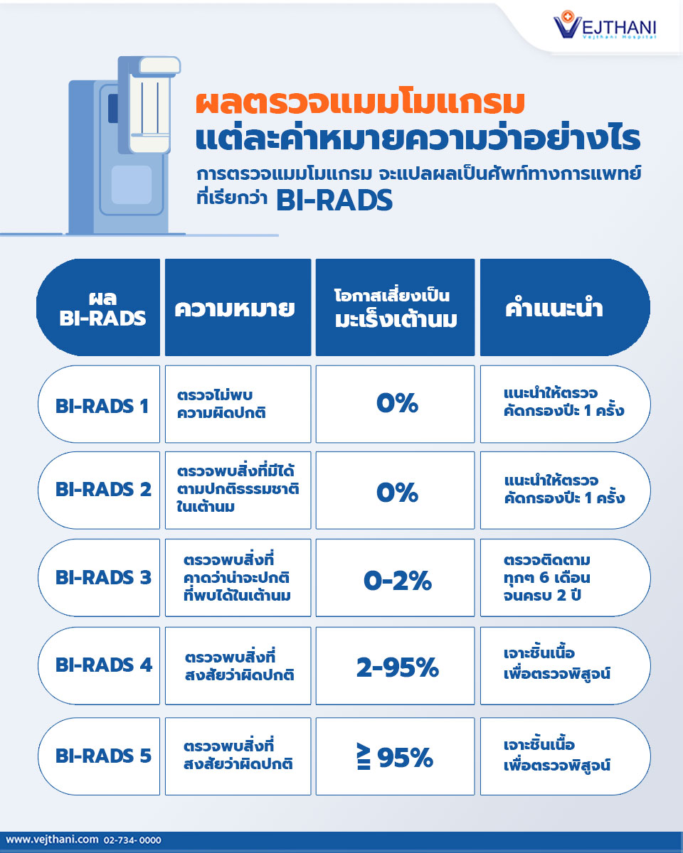 การตรวจแมมโมแกรม จะแปลผลเป็นศัพท์ทางการแพทย์ ที่เรียกว่า BI-RADS ซึ่งย่อมาจากคำว่า Breast Imaging – Reporting and Data System โดยมีค่าความผิดปกติ แบ่งเป็น BI-RADS 0 – 6 ซึ่งจะบอกว่าเรามีความเสี่ยงต่อการเป็นมะเร็งเต้านมมากน้อยเพียงไร พร้อมช่วยแนะแนวทางว่าเราควรได้รับการรักษาต่อไปอย่างไร