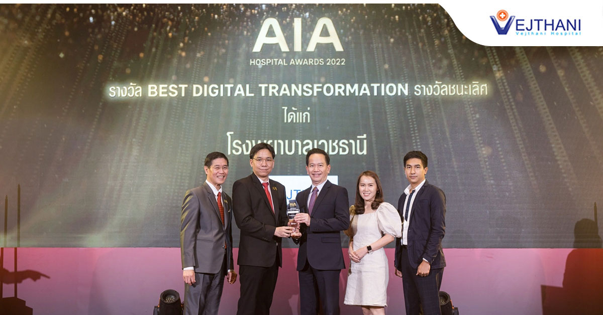 ดร.นพ.ตุลวรรธน์ พัชราภา ผู้อำนวยการปฎิบัติการ เป็นตัวแทนโรงพยาบาลเวชธานี ขึ้นรับรางวัล ชนะเลิศ Best Digital Transformation โรงพยาบาลที่เปิดรับและตอบรับนวัตกรรมทางดิจิทัลยอดเยี่ยม ประจำปี 2565 ในงาน AIA Hospital Award 2022 จากนพ.ประมุข ทรงจักรแก้ว ผู้อำนวยการ ที่ปรึกษาอาวุโส ฝ่ายปฏิบัติการ 1 และ นพ.สมสกุล ศรีพิสุทธิ์ ผู้อำนวยการ ฝ่ายประกันสุขภาพของบริษัท เอไอเอ จํากัด (มหาชน) เป็นผู้มอบรางวัล เนื่องจากโรงพยาบาลเวชธานีได้ให้ความสำคัญต่อการเข้ารับบริการของผู้ป่วย เพื่อให้เกิดความสะดวกและรวดเร็วในการใช้บริการ จึงนำเทคโนโลยี ระบบ API เข้ามาช่วยในการส่งข้อมูลไปยังบริษัทประกันฯ เพื่อความถูกต้อง รวดเร็ว ทำให้ผู้เข้ารับบริการของโรงพยาบาลเวชธานีได้รับบริการเคลมสินไหมได้รวดเร็วขึ้น