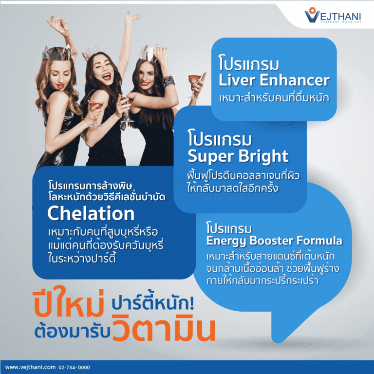นายแพทย์อรรถสิทธิ์ อมรถนอมโชค แพทย์ประจำศูนย์ Vejthani Q Life โรงพยาบาลเวชธานี ระบุว่า การ ปาร์ตี้ แบบสุดเหวี่ยงหรือต่อเนื่องหลาย ๆ วัน อาจจะส่งผลกระทบต่อสุขภาพได้ไม่แพ้ความเครียดจากการทำงาน ศูนย์ Vejthani Q Life จึงพัฒนาโปรแกรมฟื้นฟูร่างกายด้วยการให้วิตามินและสารอาหารที่สำคัญทางหลอดเลือด