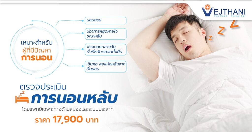 ตรวจประเมินการนอนหลับ โดยแพทย์เฉพาะทางด้านสมองและระบบประสาท คุณมีอาการเหล่านี้หรือไม่ นอนกรน มีอาการหยุดหายใจขณะหลับ ง่วงนอนตอนกลางวัน ทั้งที่หลับตลอดทั้งคืน เจ็บคอ คอแห้งหลังจากตื่นนอน