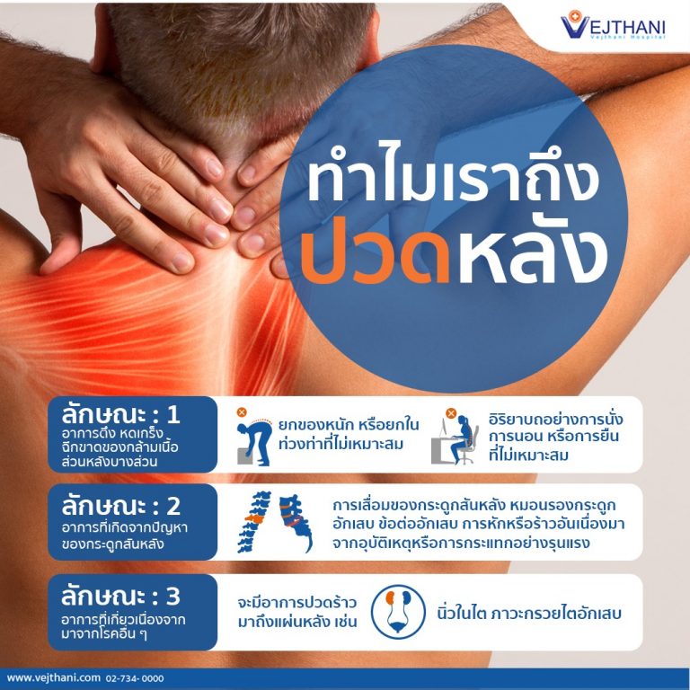 อาการปวดหลังส่วนใหญ่มักเกิดใน 3 ลักษณะด้วยกัน ลักษณะ1 อาการตึง หดเกร็ง หรือฉีกขาดของกล้ามเนื้อส่วนหลังบางส่วน ซึ่งเป็นผลมาจากการที่ยกของหนักหรือยกในท่วงท่าที่ไม่เหมาะสม การเคลื่อนไหวที่ผิดท่าทางไปจากเดิมอย่างกะทันหัน