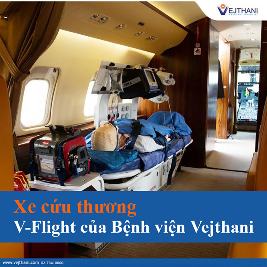 Đội cứu thương hàng không V-Flight của Bệnh viện Vejthani sẽ nhanh chóng và hiệu quả sắp xếp việc vận chuyển y tế bằng đường hàng không đến điểm đến mong muốn của bạn. Đội cứu thương hàng không V-Flight của Bệnh viện Vejthani sẽ xử lý tất cả các thủ tục giấy tờ liên quan đến công ty bảo hiểm, thị thực, lên lịch trình, hãng hàng không, chuyển tuyến và vận chuyển mặt đất để người thân của bạn cảm thấy an toàn và được chăm sóc chu đáo.